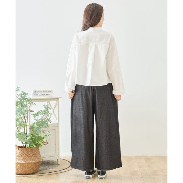 裾レース切替 デニムライク ガウチョパンツ ワイドパンツ ウエストゴム 綿100%