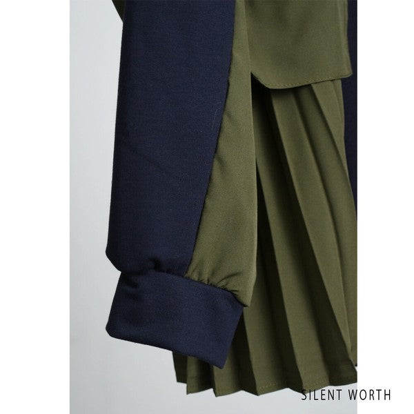 ・動きを生む「サイドプリーツ」 歩くたび、風になびくたびにふわりと揺れるサイドのプリーツが最大の魅力。異素材のコントラストが視覚的なアクセントとなり、一枚で着ても手抜きに見えません。