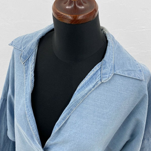 コットン素材のデニムチュニックブラウス。深Vネックなのでインナー着用必須◎。