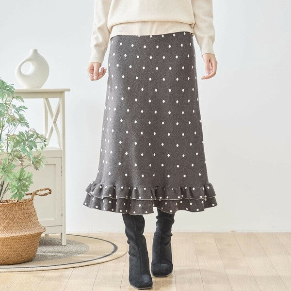 【M〜L】ドットジャガードニットスカート|amie studio レディース ミモレ丈 ウエストゴム 裾フリル N42-160