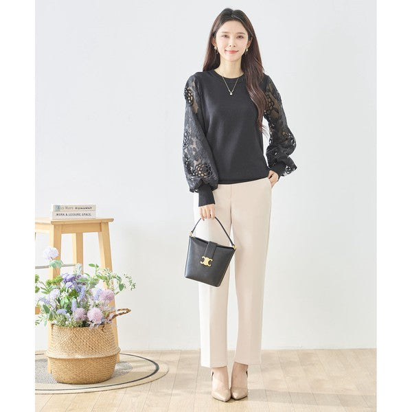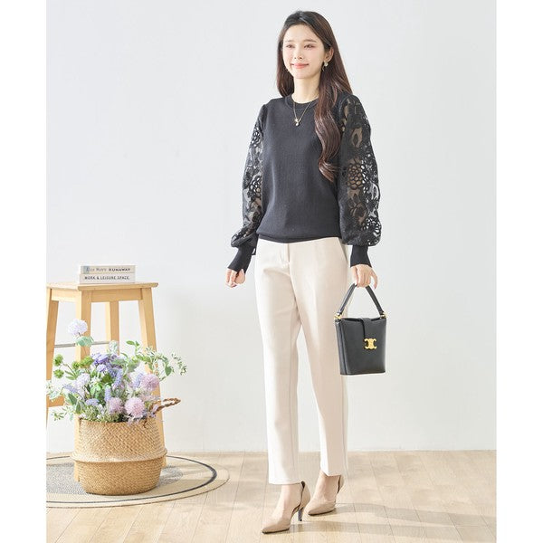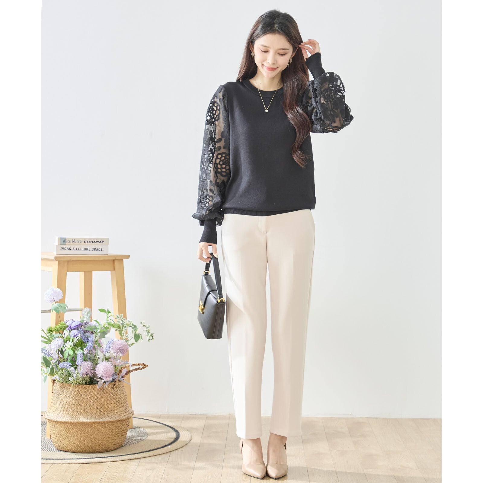 身頃にはレーヨン×ナイロンのしっとりとなめらかなニット素材を使用。 袖部分を繊細な花柄刺繍レースで切り替えることで、上品な透け感とフェミニンな華やかさをプラスしました。