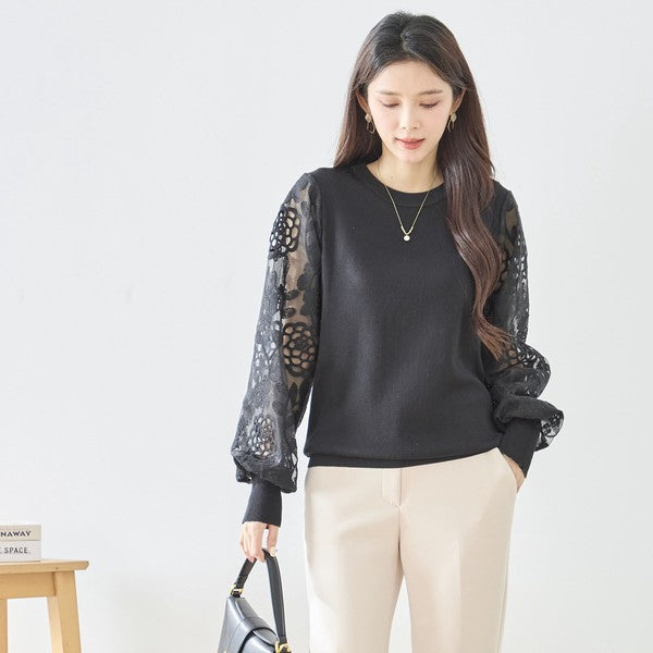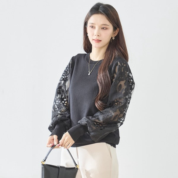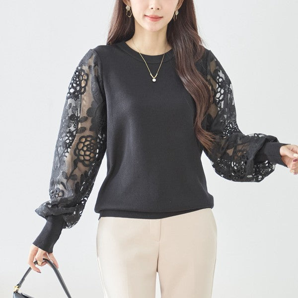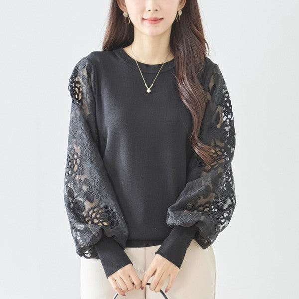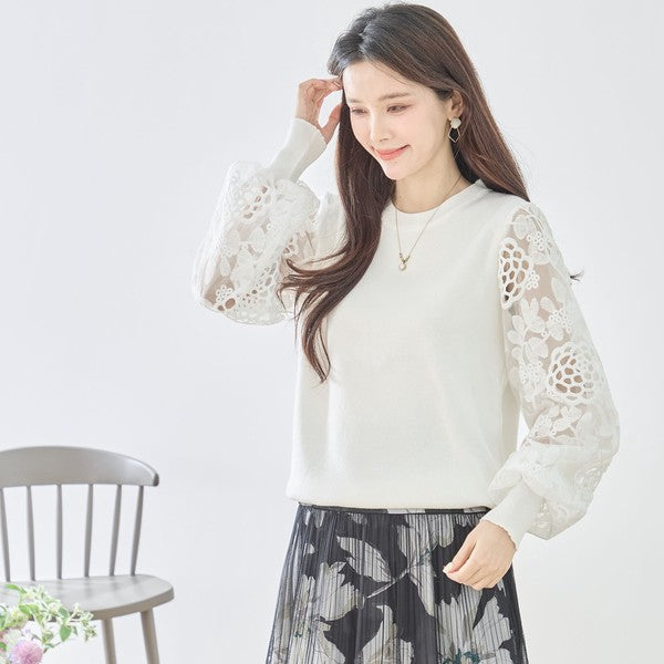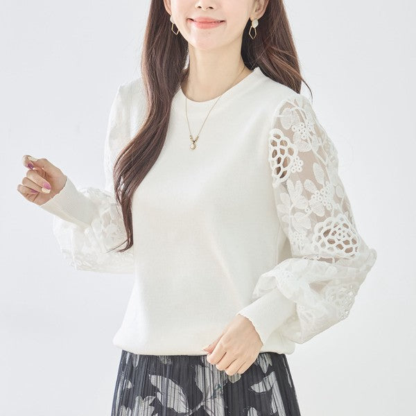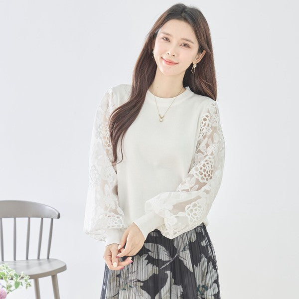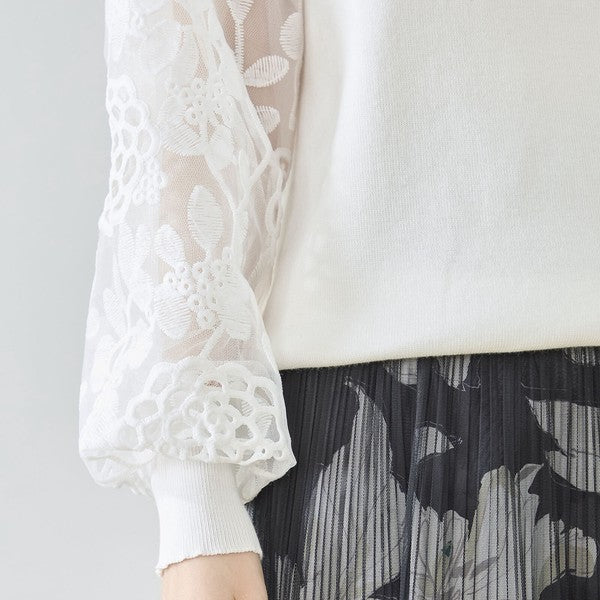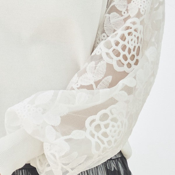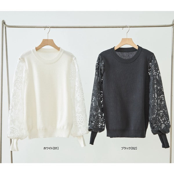 【M-L】袖レースニットトップス 花柄刺繍 異素材ドッキング ぽわん袖 春 TRUBE N12-1023