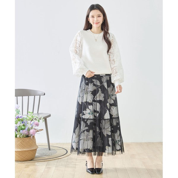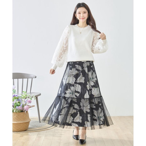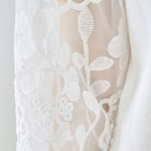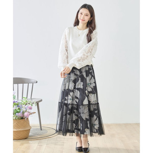・繊細な「花柄刺繍レース袖」 チュールのような軽やかな素材に、立体感のある花柄刺繍を施しました。肌がほんのりと透けるシアー感が、大人の色香と春らしい軽やかさを演出します。