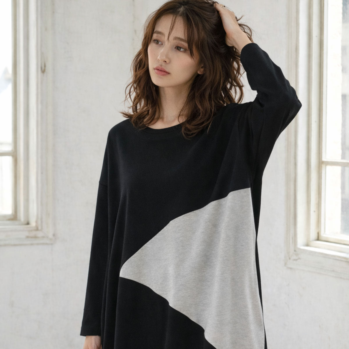 【着心地もちもち。一枚で主役級のモードな配色チュニック】