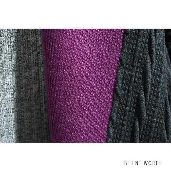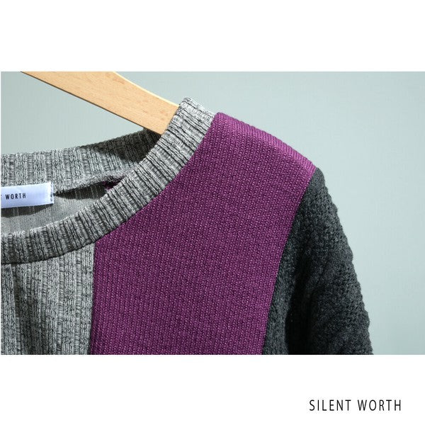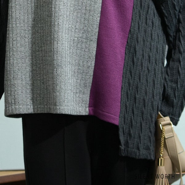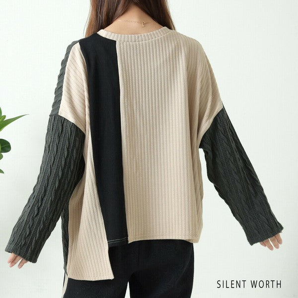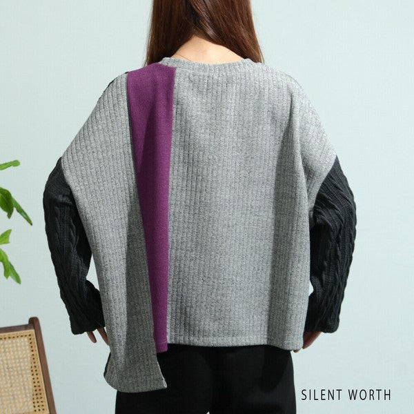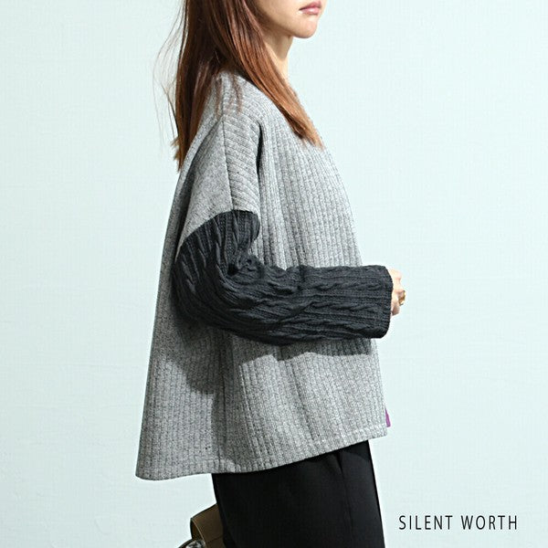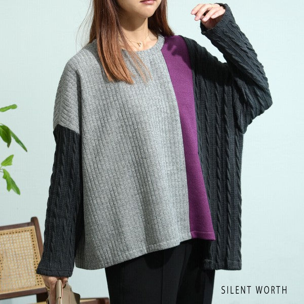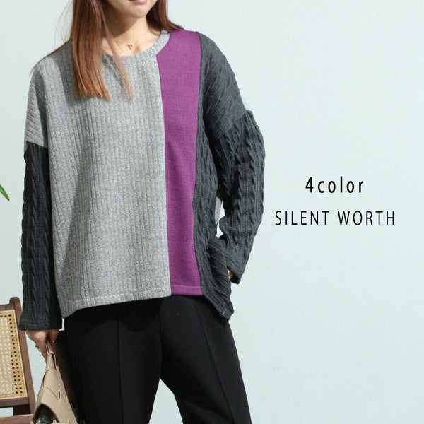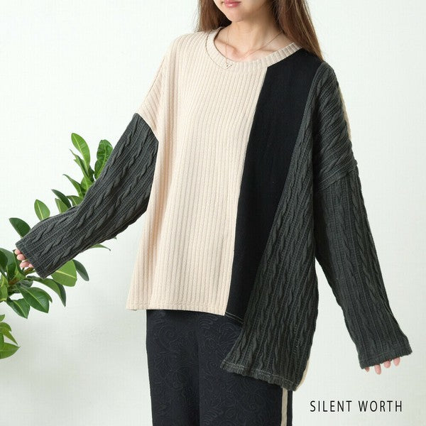 【Mサイズ】ふくれジャカード配色プルオーバー|異素材切替・体型カバー・長袖トップス・秋冬・Z-093