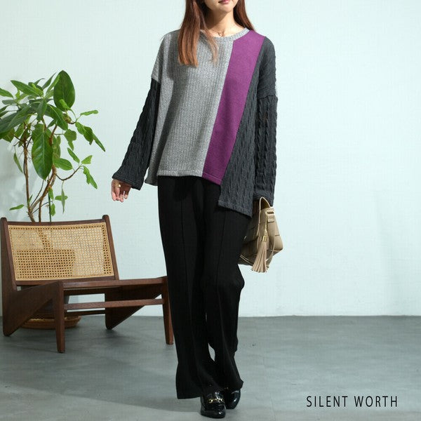 【M〜L】異素材配色デザイン アシメ切替プルオーバー|ゆったり体型カバー カジュアルトップス Z-094