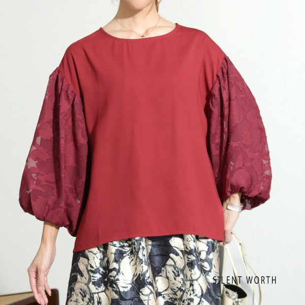 カジュアルからオケージョンまで幅広く使える大人トップス「SILENT WORTH」から、立体的な袖のバルーンデザインが印象的なプルオーバーが登場。袖部分にはシアー素材に繊細なフラワー模様を施し、女性らしさを引き立てます。前後差のあるロングテールシルエットで、パンツにもスカートにも合わせやすいバランス感。袖には裏地を付け、透けすぎない安心感も嬉しいポイント。オンオフ問わず幅広いシーンで活躍する、大人のための一枚です。