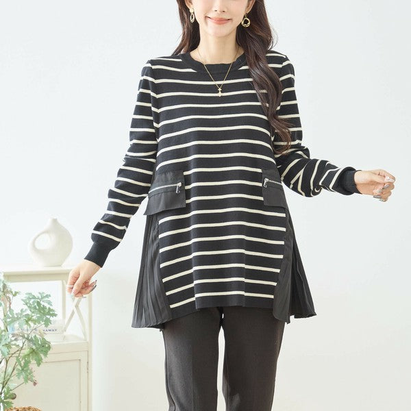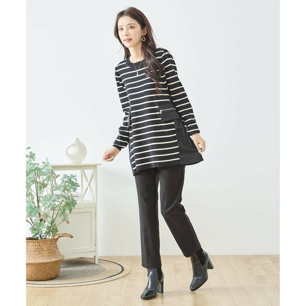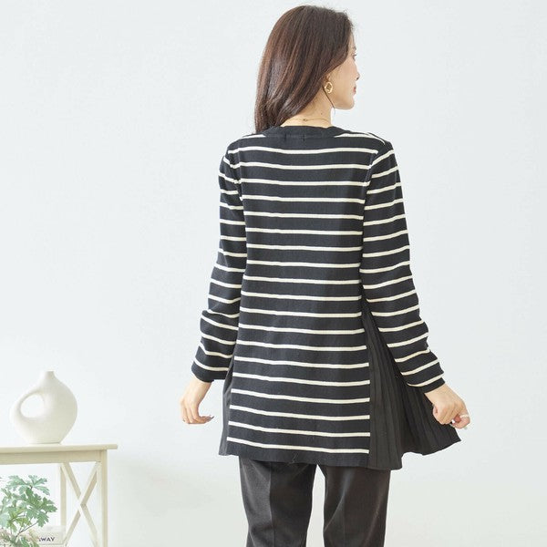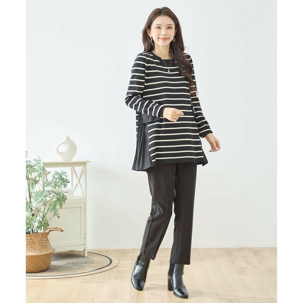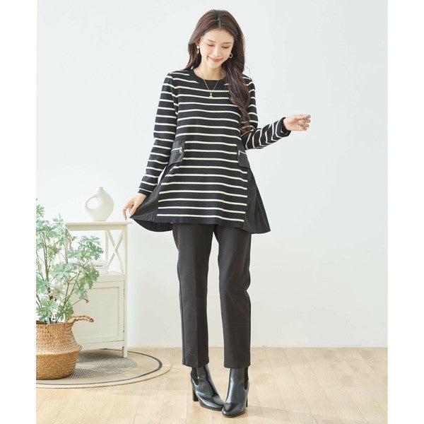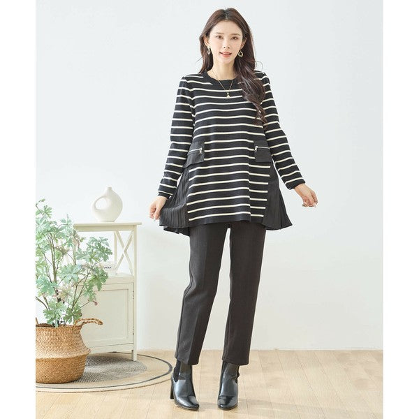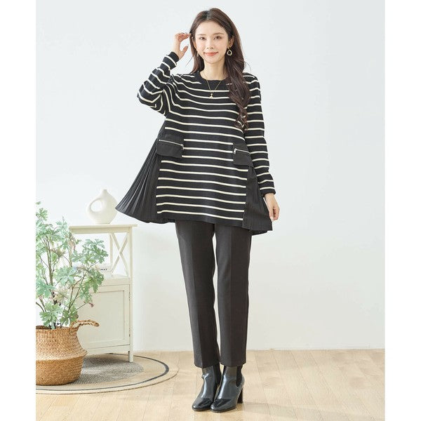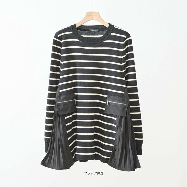 【M〜L】プリーツ切替ボーダーチュニックプルオーバー|モード感×体型カバー・reve bleu・N12-888