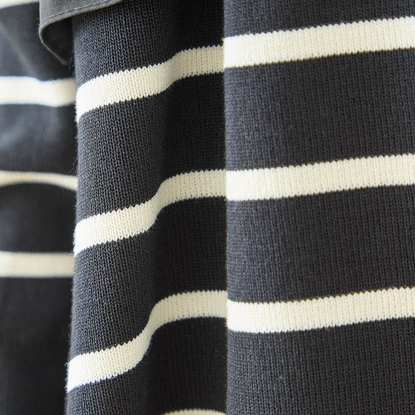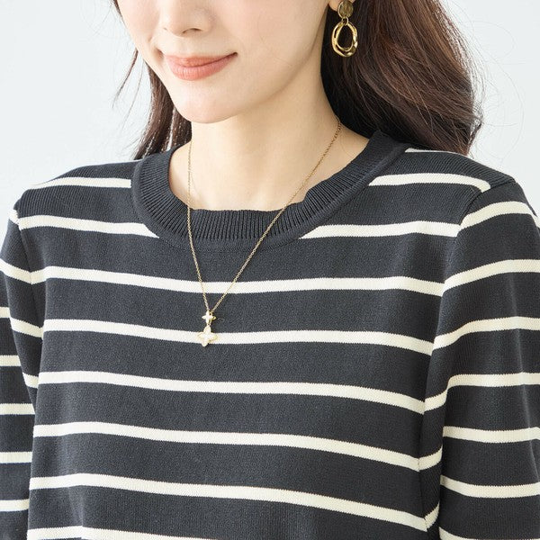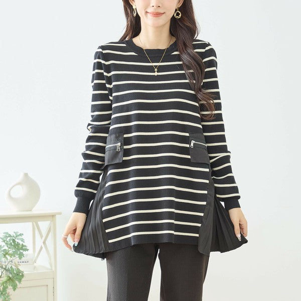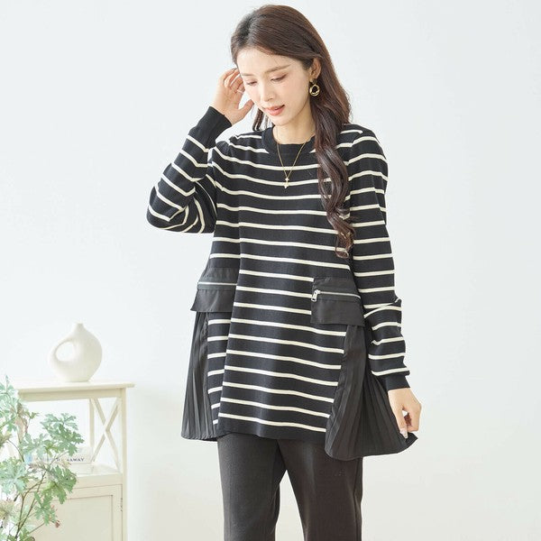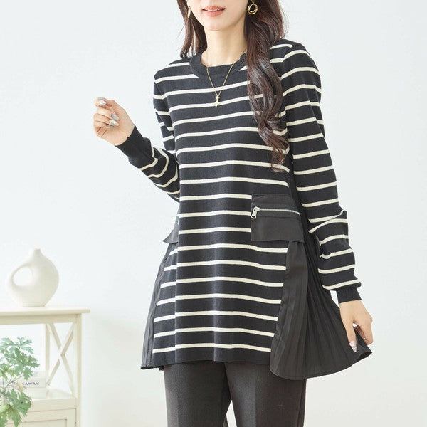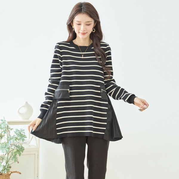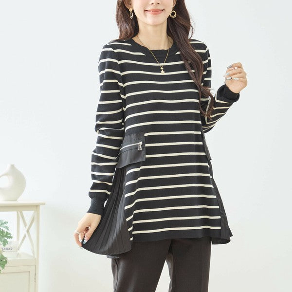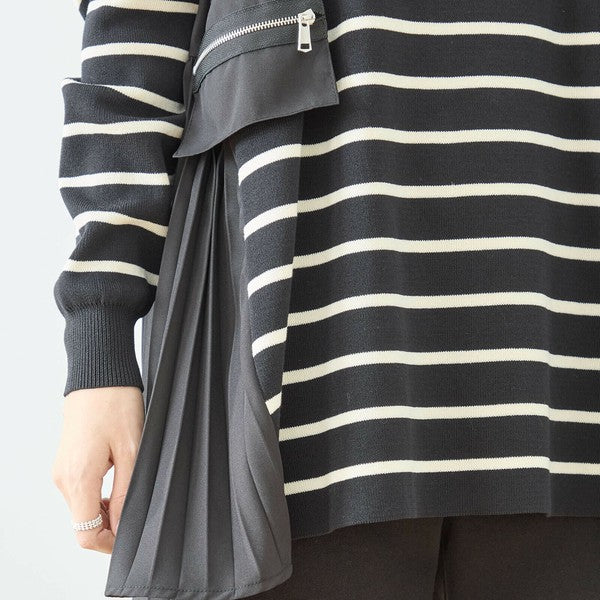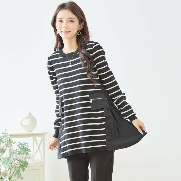 【M〜L】プリーツ切替ボーダーチュニックプルオーバー|モード感×体型カバー・reve bleu・N12-888