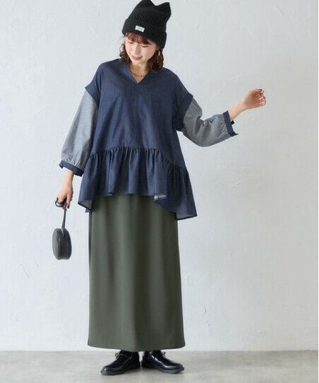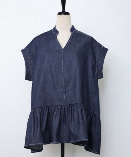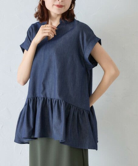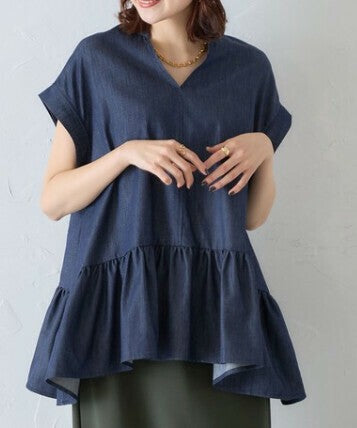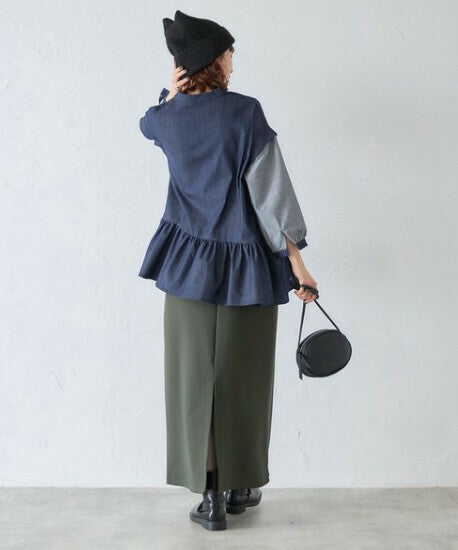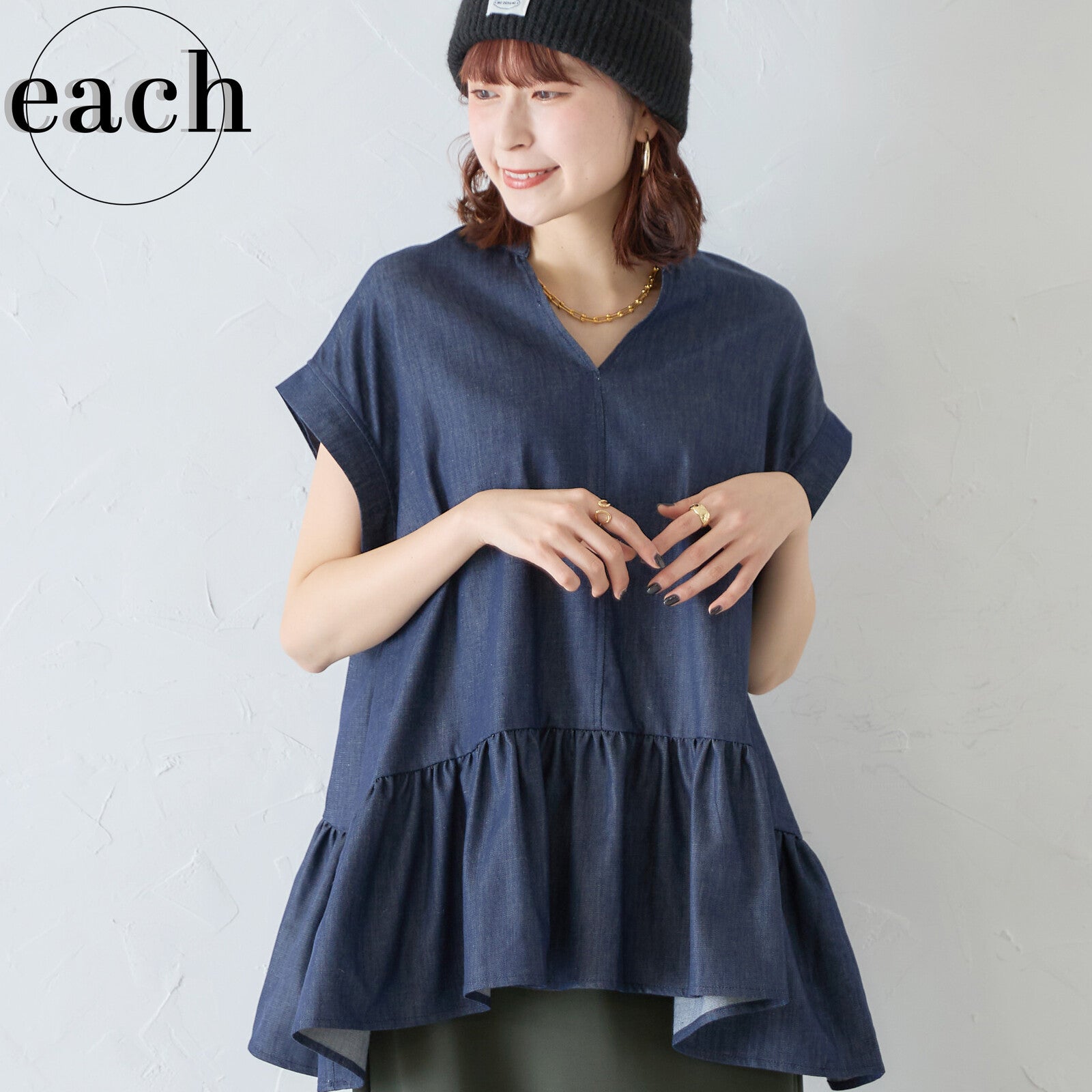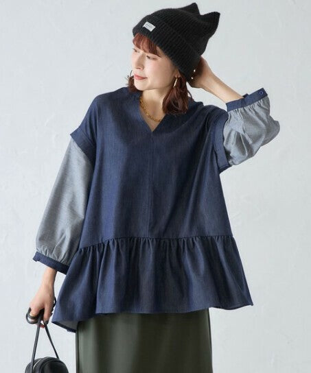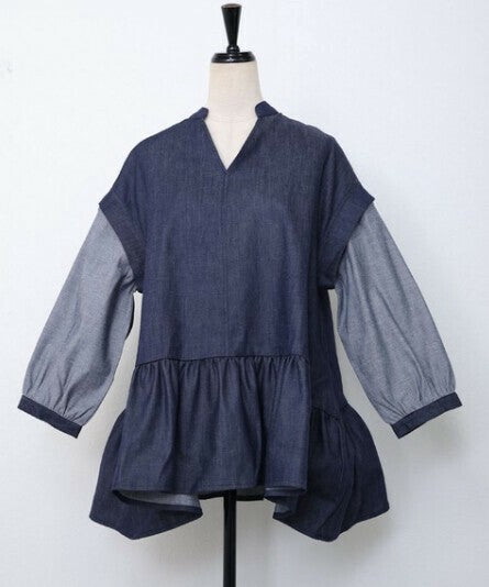 【M〜L】2WAY袖取り外し可デニムペプラムトップス|長袖・半袖切替・体型カバー・カジュアルフェミニン・each 193330