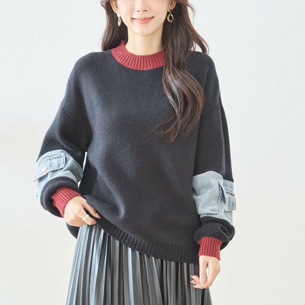 【M〜L】カラーネック×デニムスリーブニットトップス|配色リブ・体型カバー・大人カジュアル|TRUBE N15-258