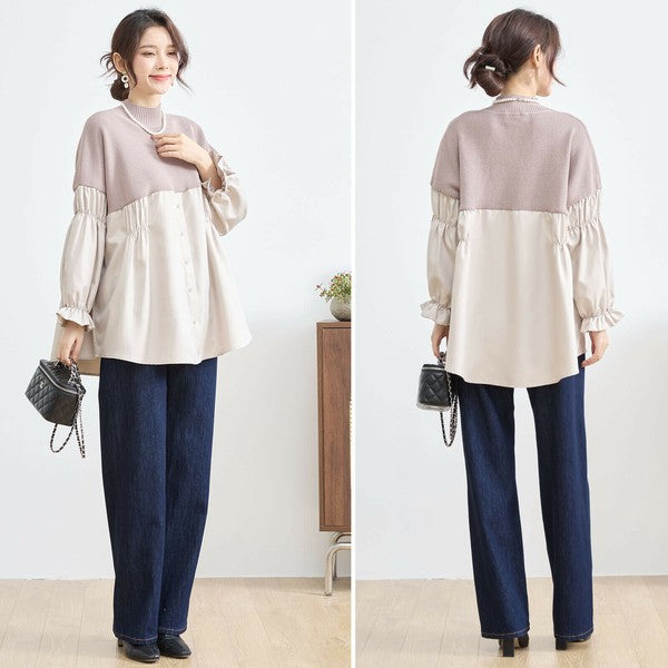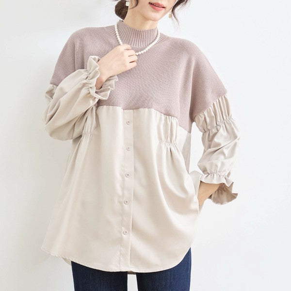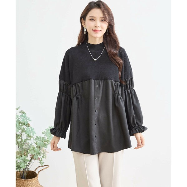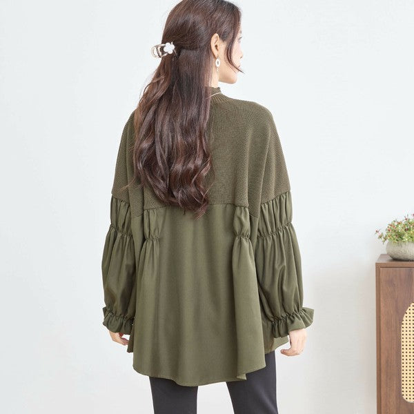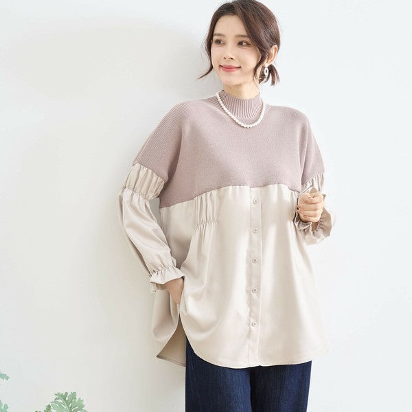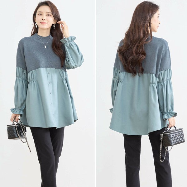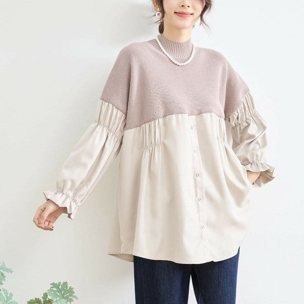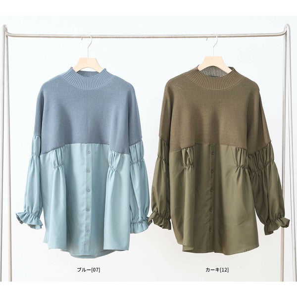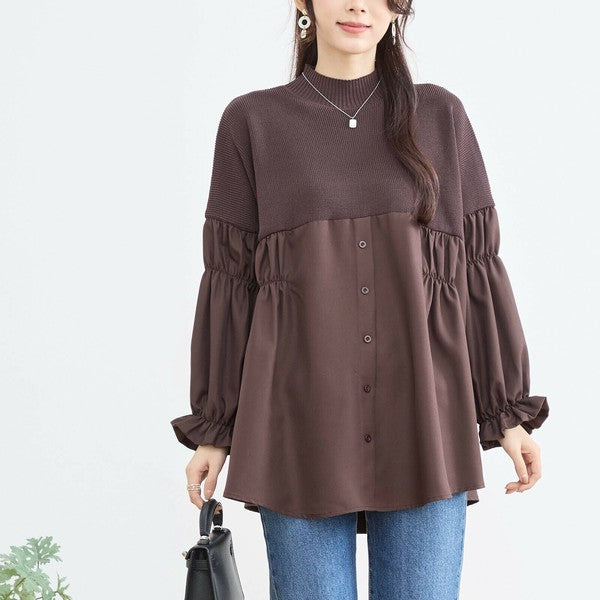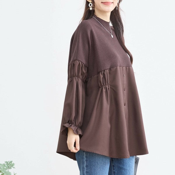 【L〜LL】ドッキングリブニットブラウス|ギャザー袖・切替デザイン・長袖トップス・C31-595B