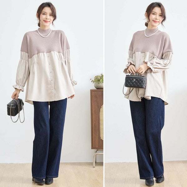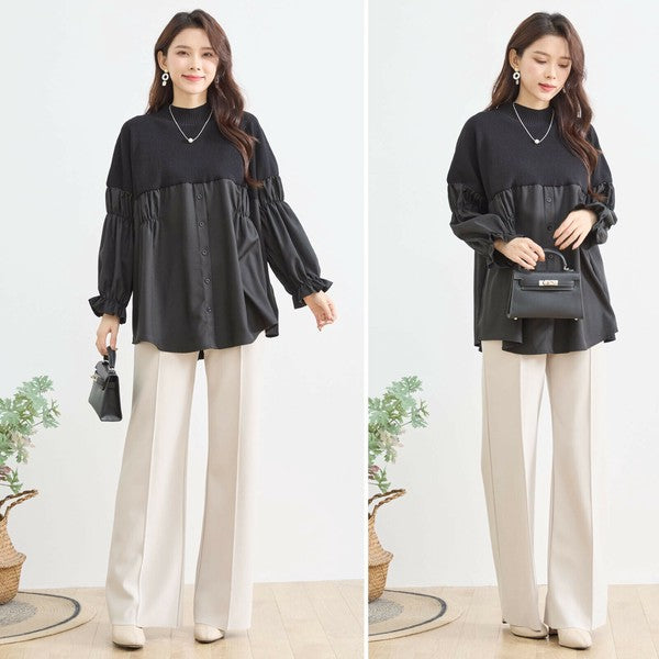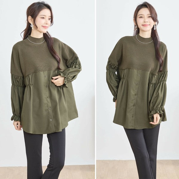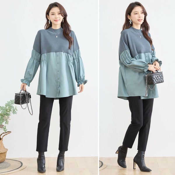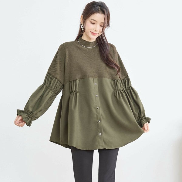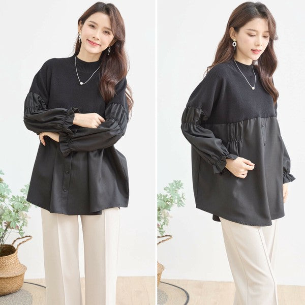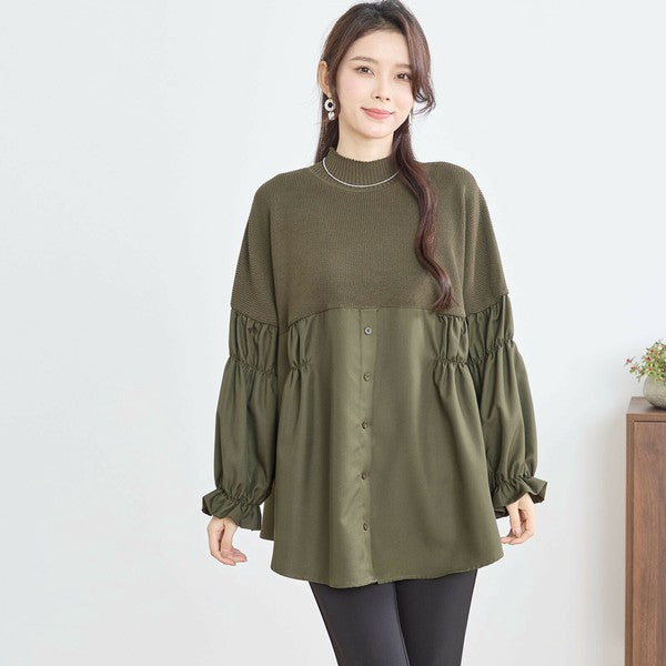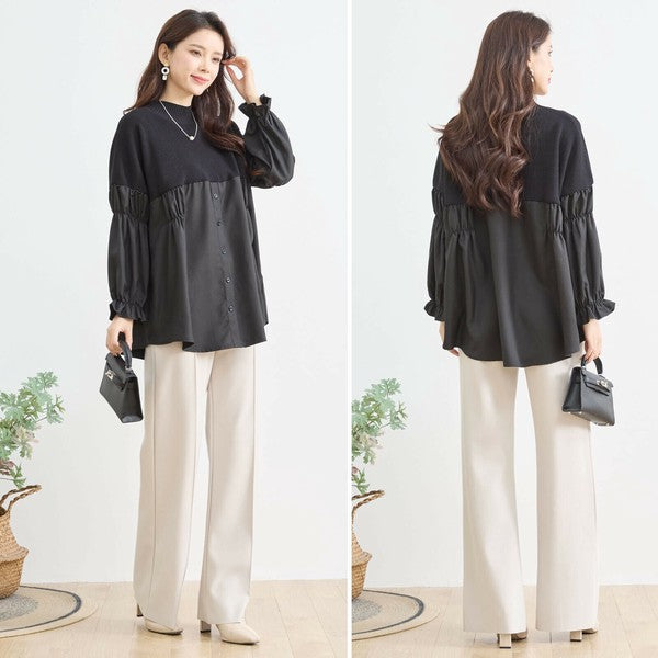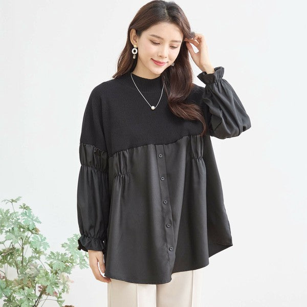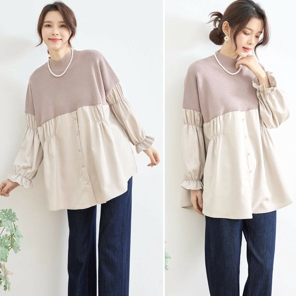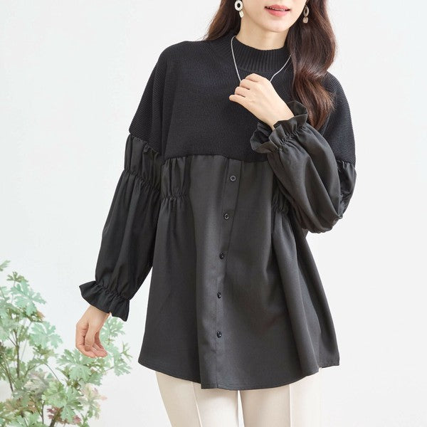 【L〜LL】ドッキングリブニットブラウス|ギャザー袖・切替デザイン・長袖トップス・C31-595B