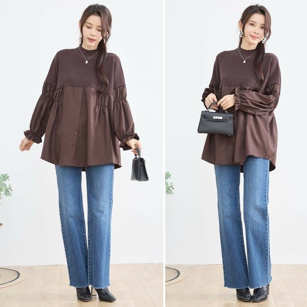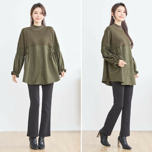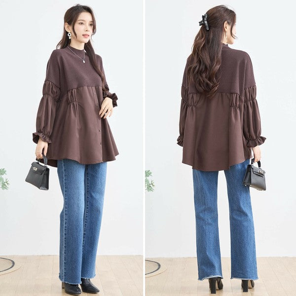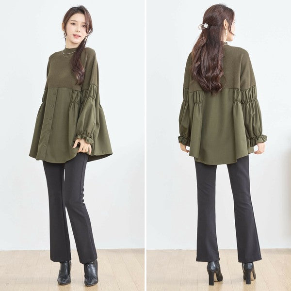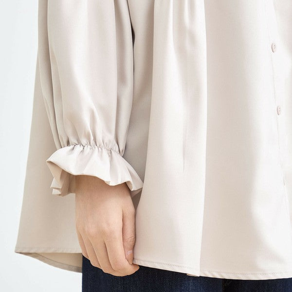 ボトルネックの首元がすっきりと見せてくれ、袖のギャザーがふんわりとした印象をプラス。