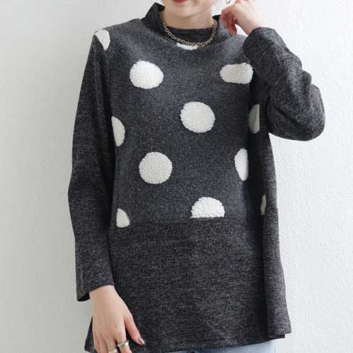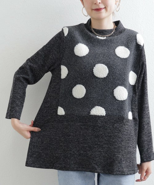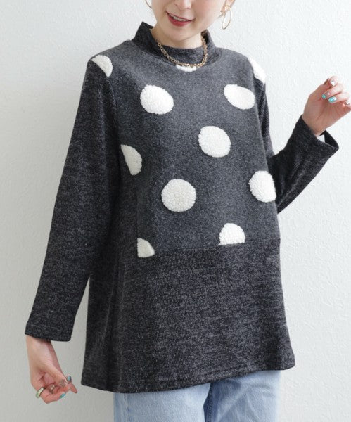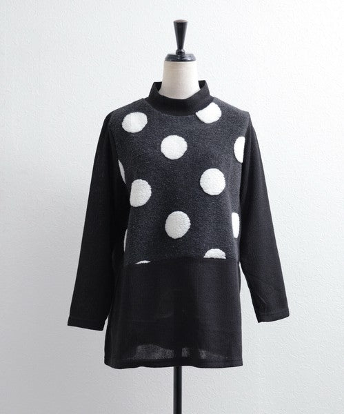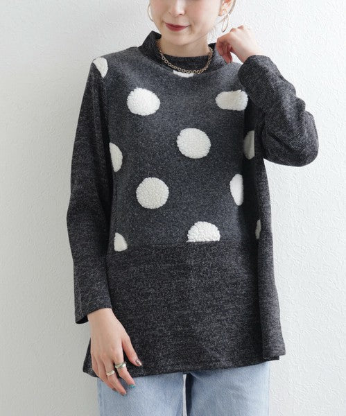【M〜L】もこもこドット柄ハイネック長袖トップス|立体デザイン・あったか微起毛・Economico 1551