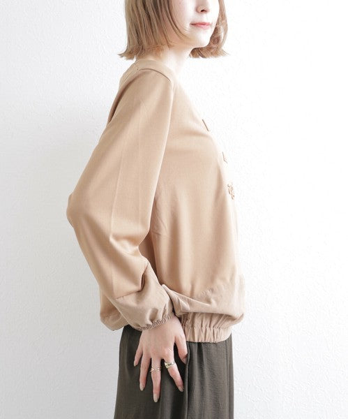 ゆったりとしたシルエットで体型をカバーしながらも、胸元の立体的なフラワーモチーフが上品に輝き、カジュアルコーデをワンランクアップさせてくれる万能トップスです。