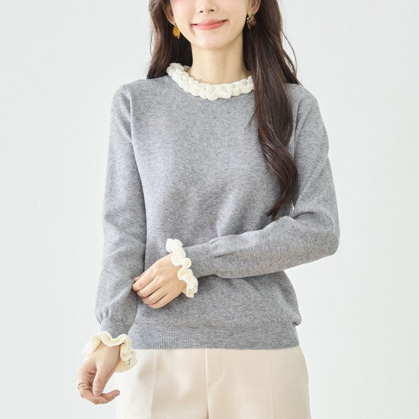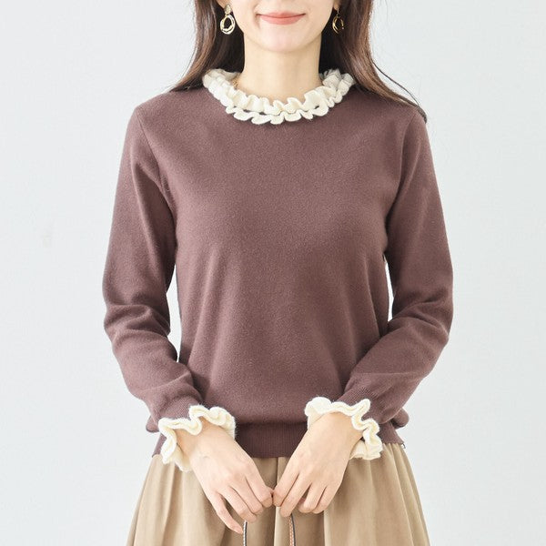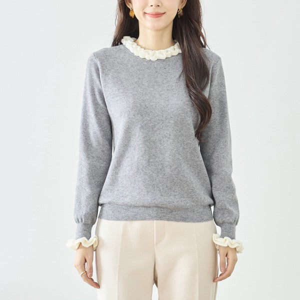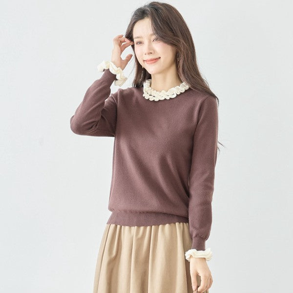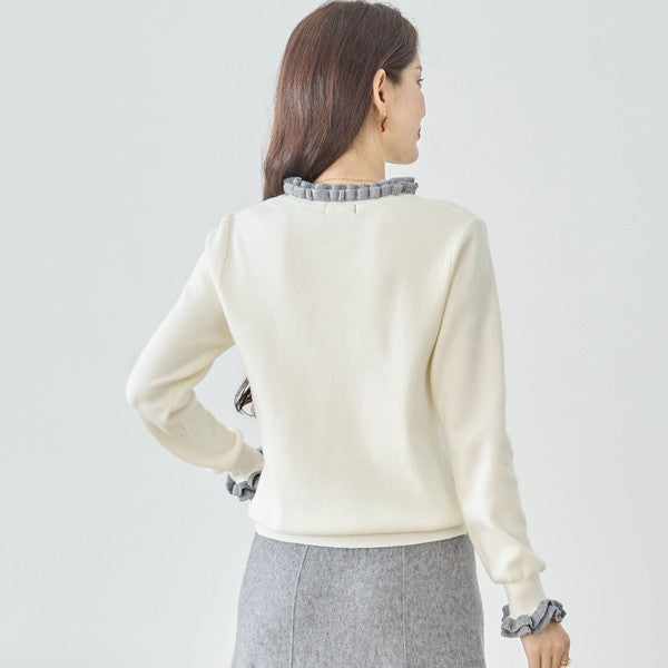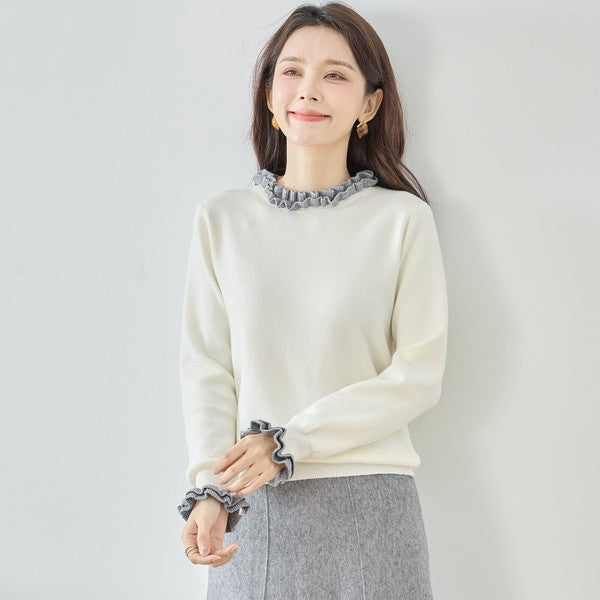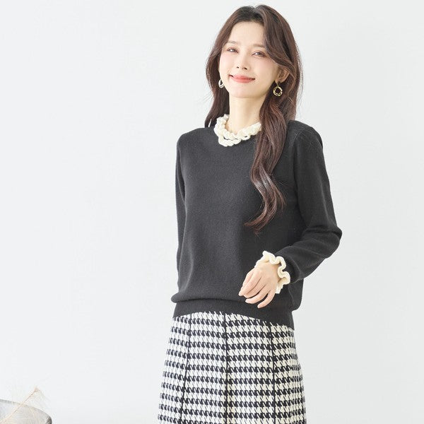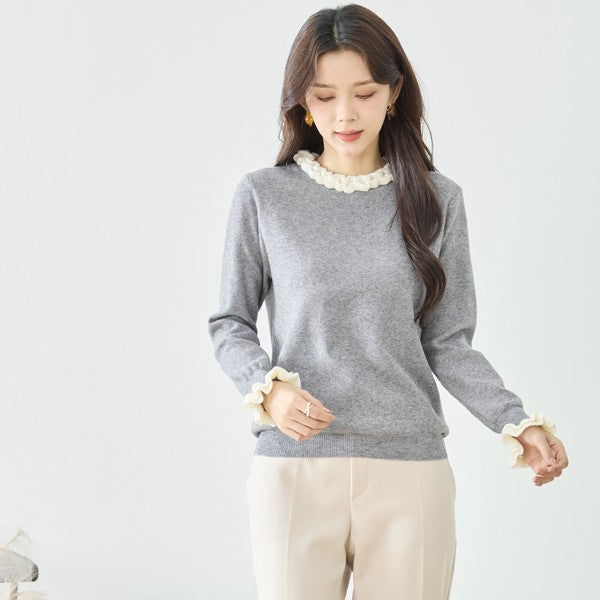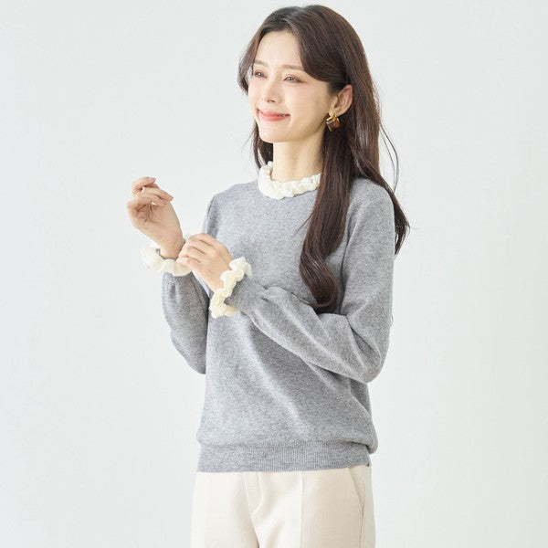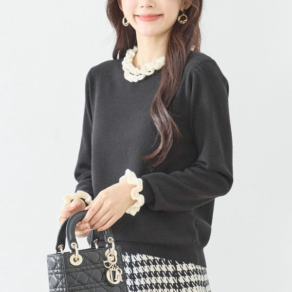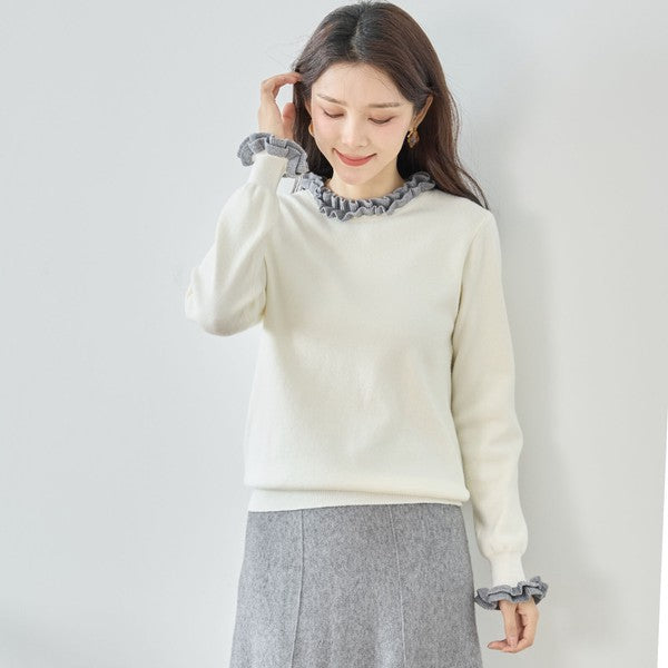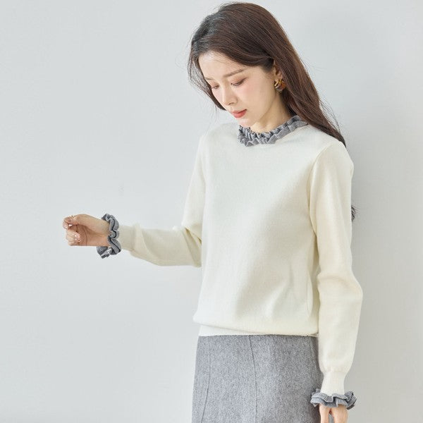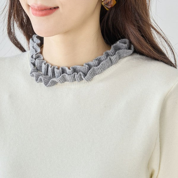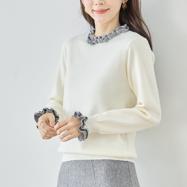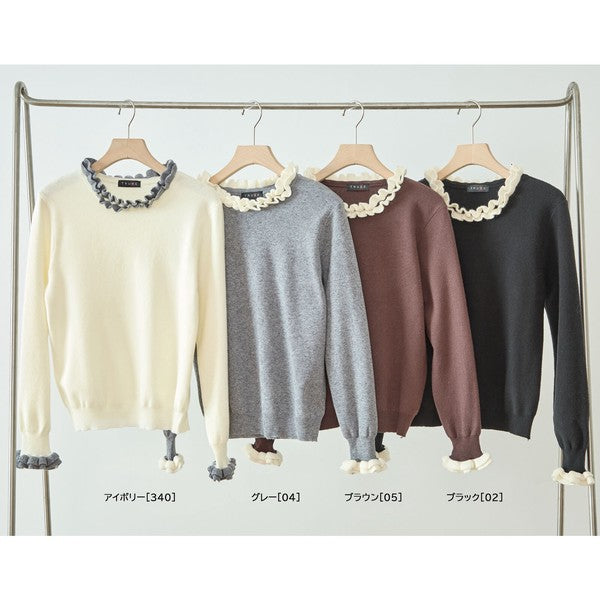 【M〜L】異素材フリルネックニットプルオーバー|柔らかレーヨン混・上品フリルデザイン|長袖トップス・N12-953