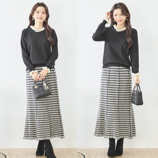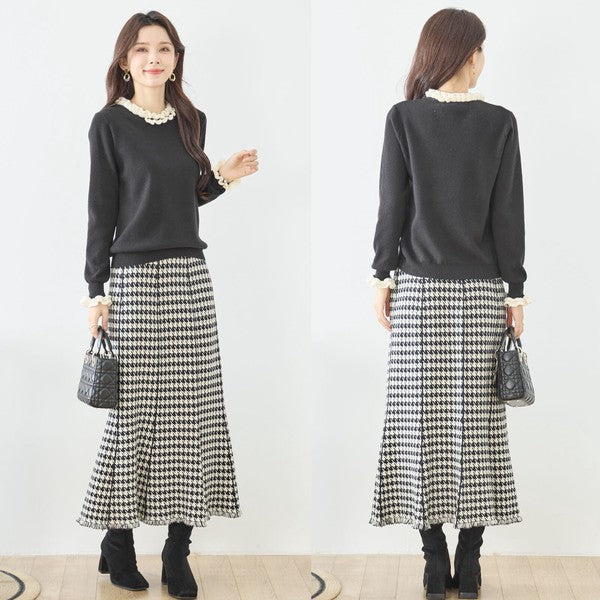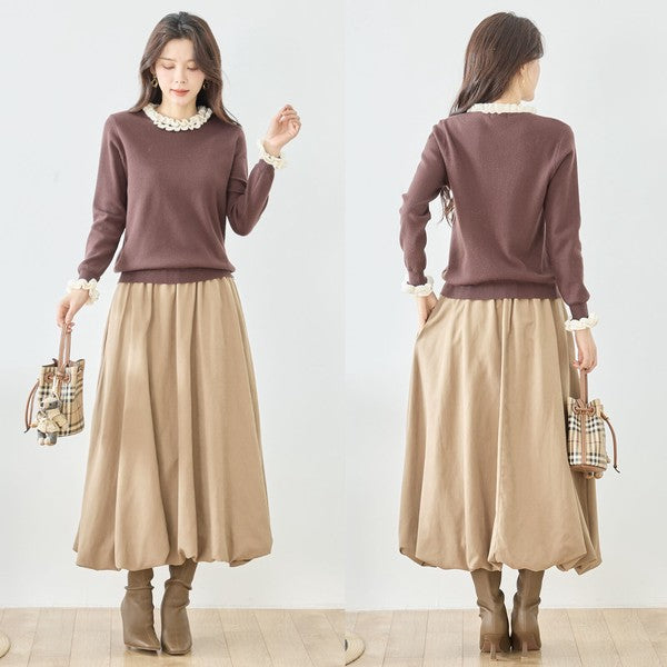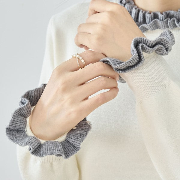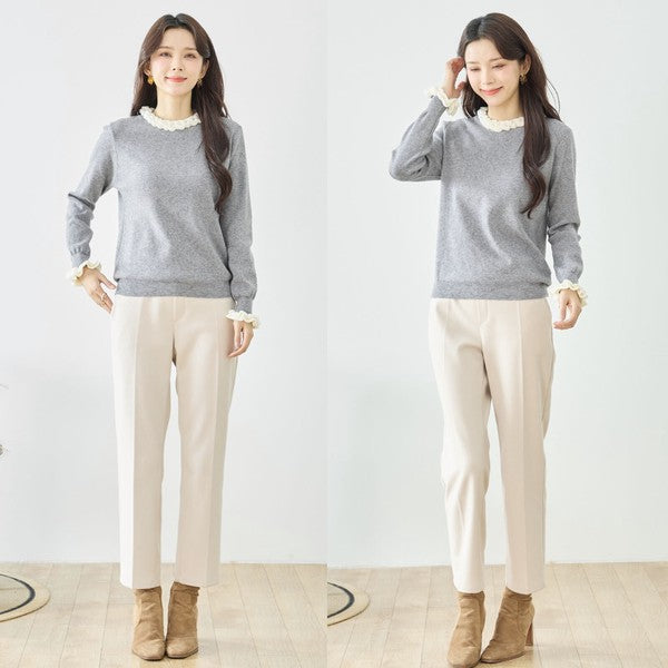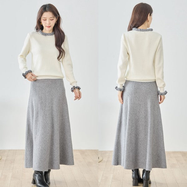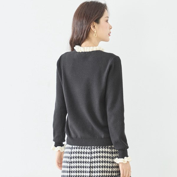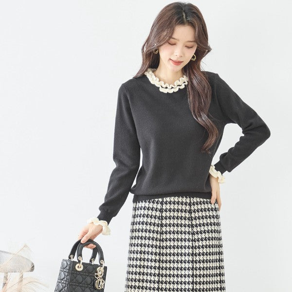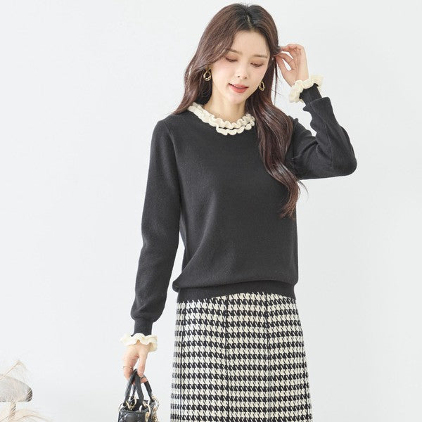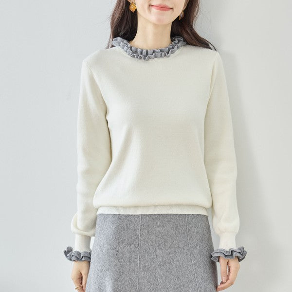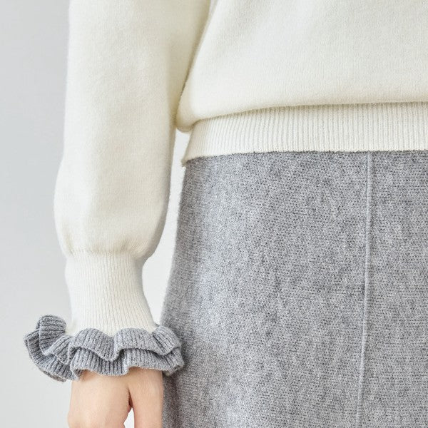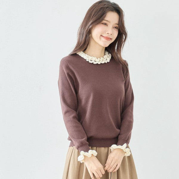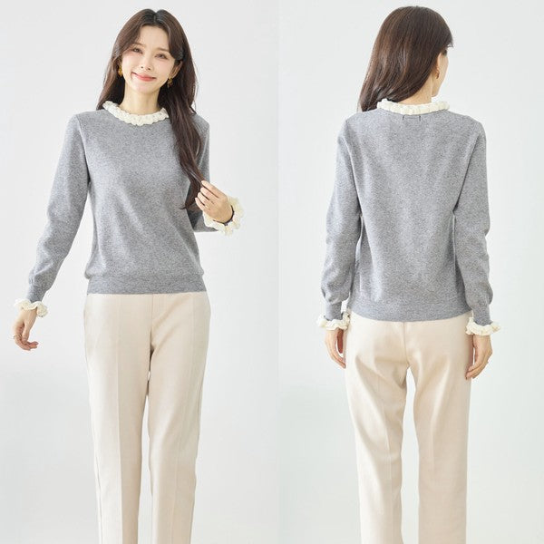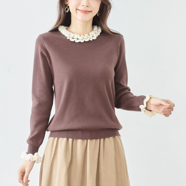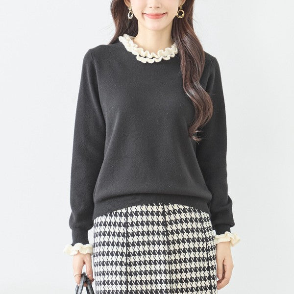 【M〜L】異素材フリルネックニットプルオーバー|柔らかレーヨン混・上品フリルデザイン|長袖トップス・N12-953