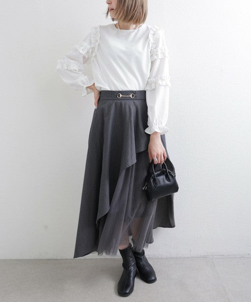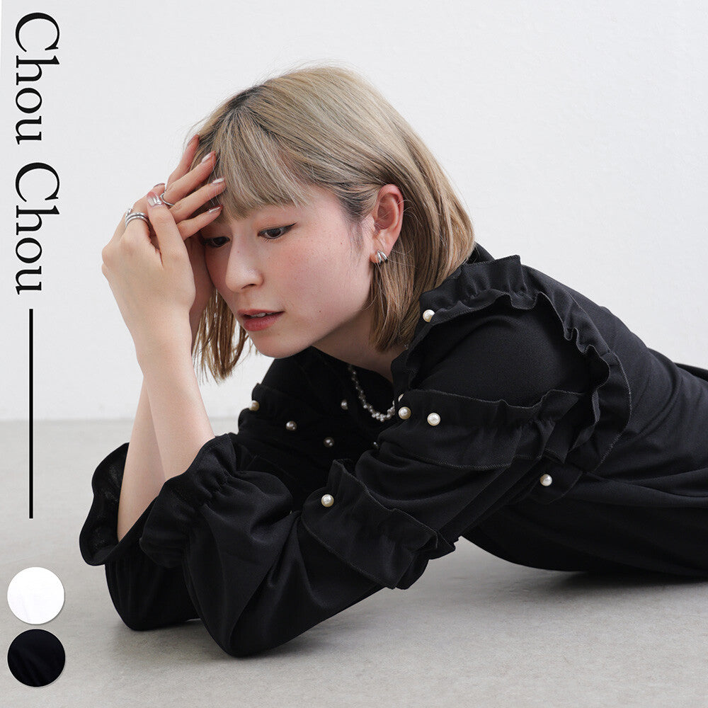 華やかな袖デザインが目を惹く、chouchouのお袖フリルパール付T。上品なパールと大きなフリルが女性らしさを演出し、シンプルなボトムと合わせるだけでコーディネートが完成します。オンオフ問わず幅広く活躍する一枚です。