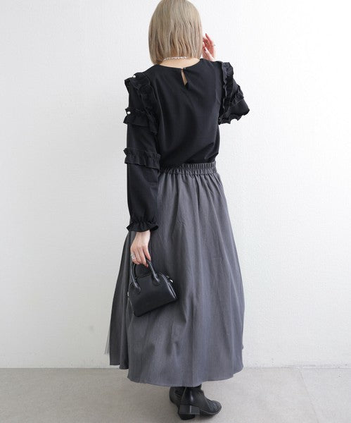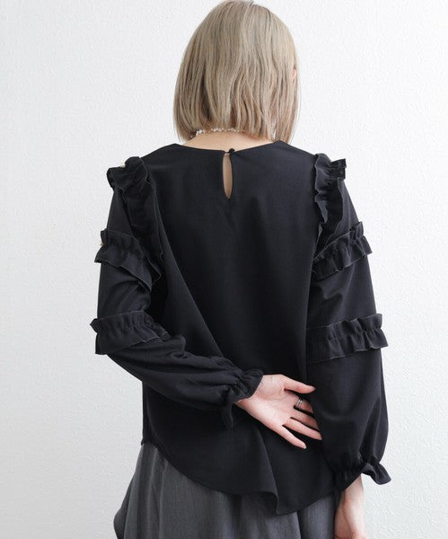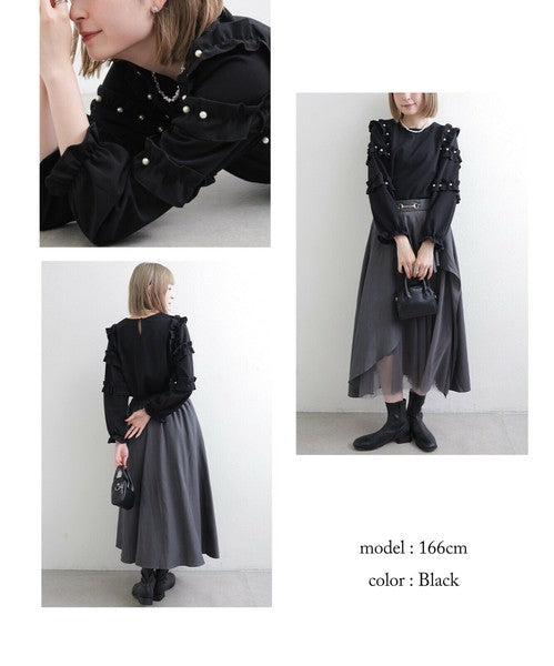 袖に大ぶりフリルとパールをあしらった華やかデザイン