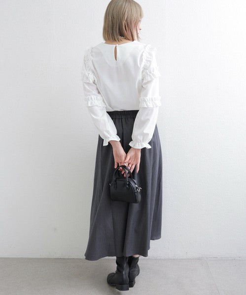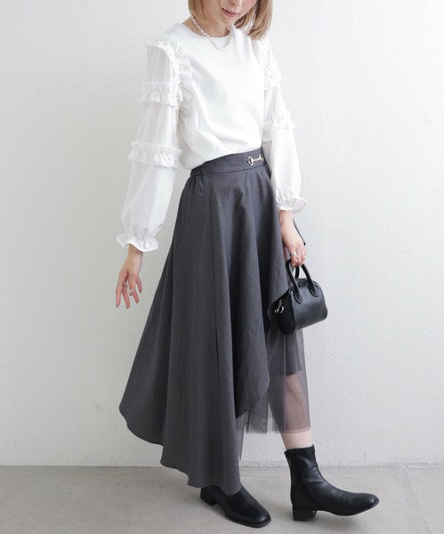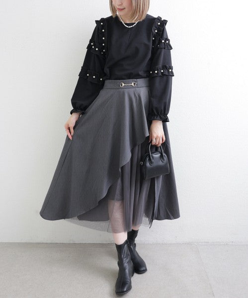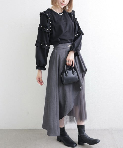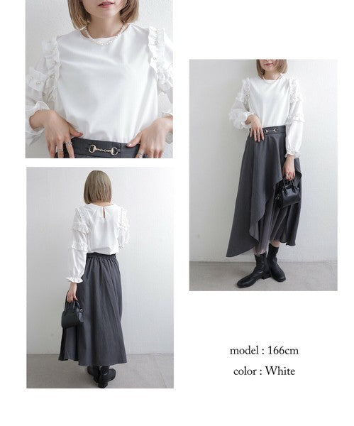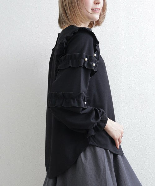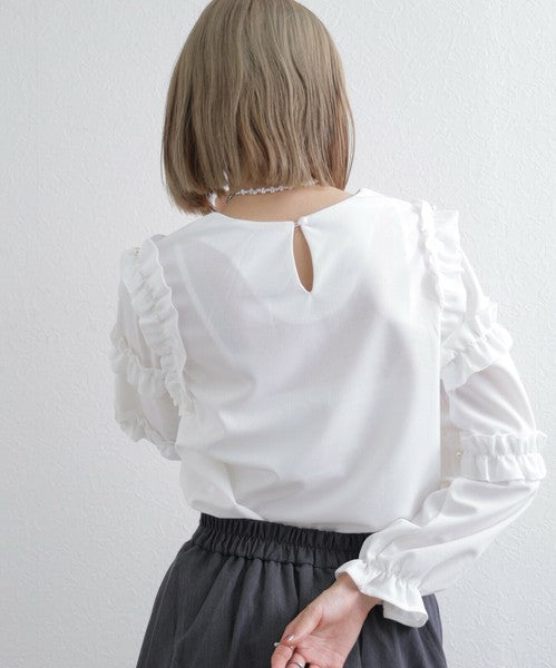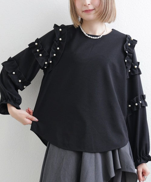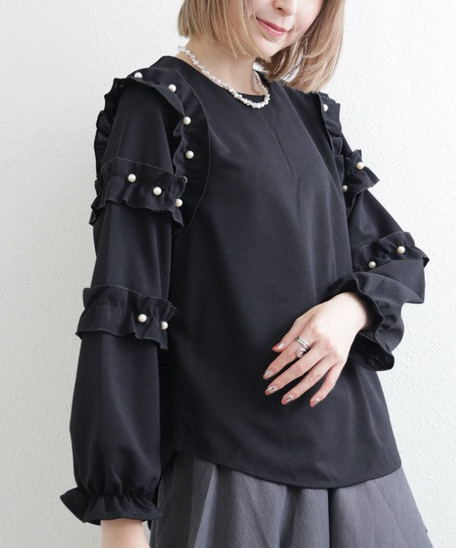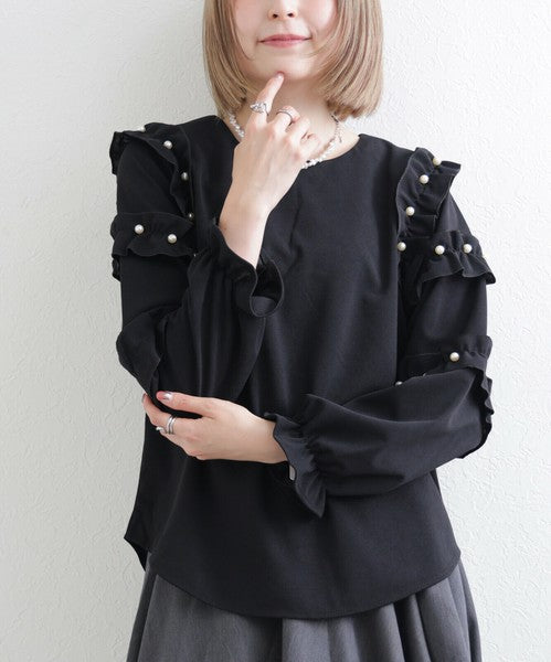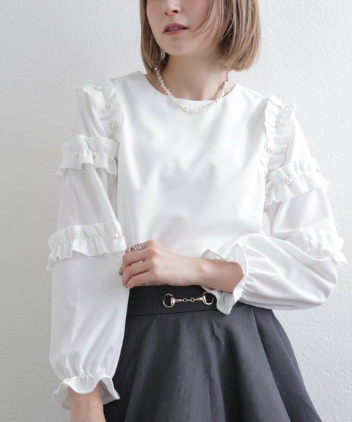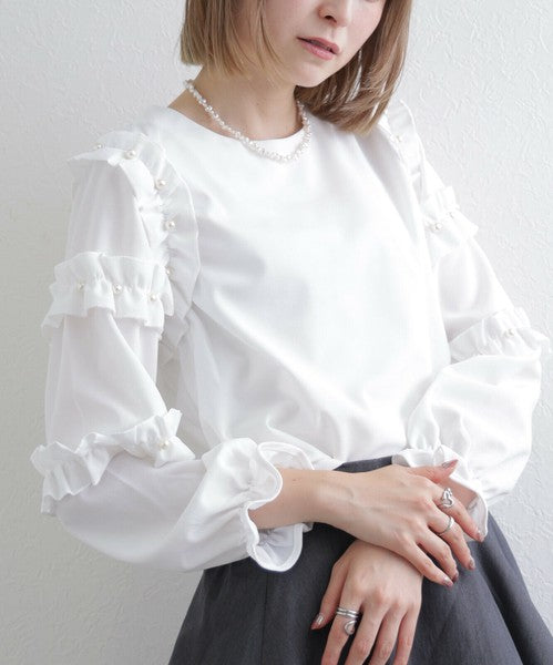 【M〜L】お袖フリルパール付T|フリル袖×パール装飾・上品可愛いブラウス風カットソー・長袖トップス 199923