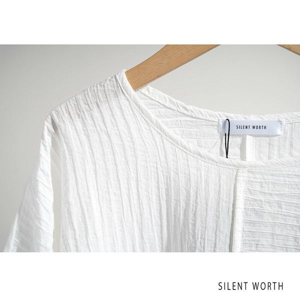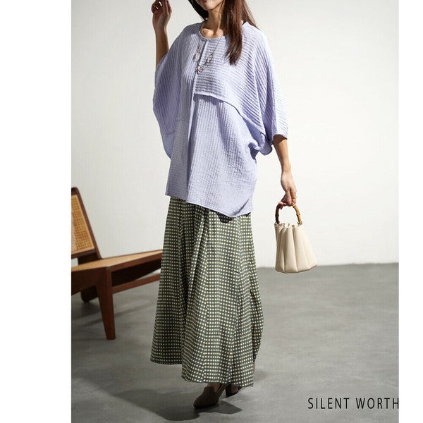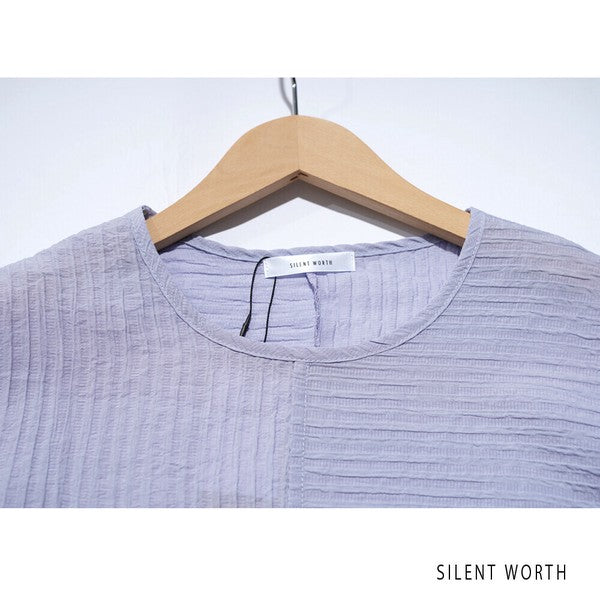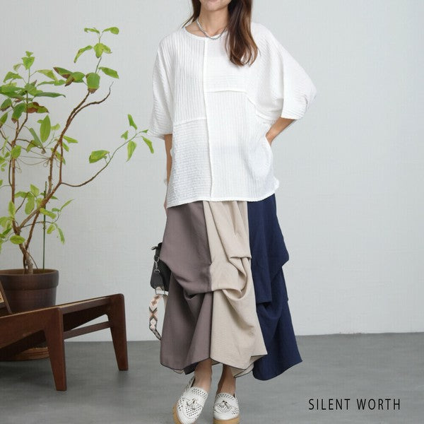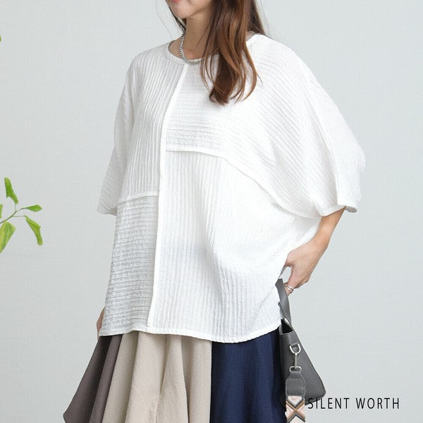 SILENT WORTHの「切替デザインジャカードプルオーバー」。表面感のあるジャカード素材とゆるやかなシルエットで、夏のコーデに涼しさとこなれ感をプラス。パンツにもスカートにも合わせやすく、着回し力抜群の一枚です。