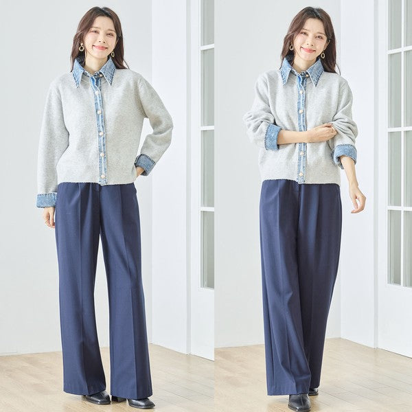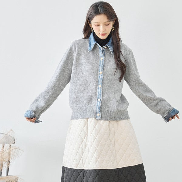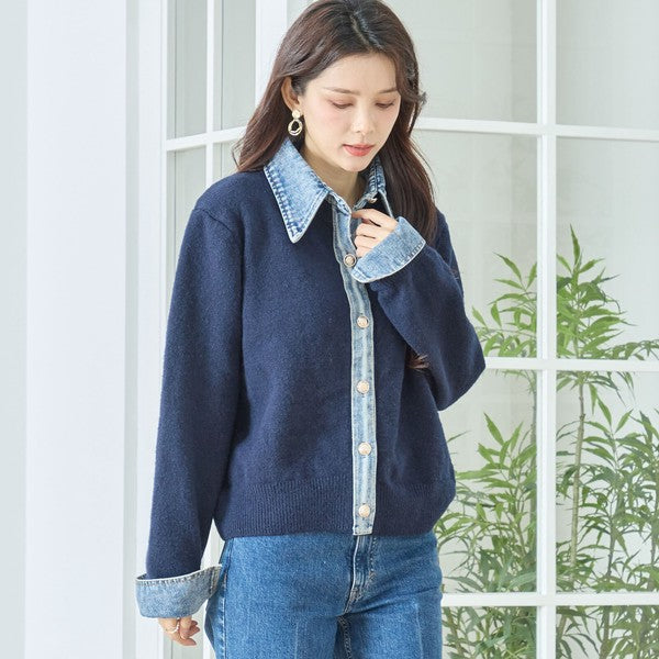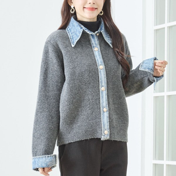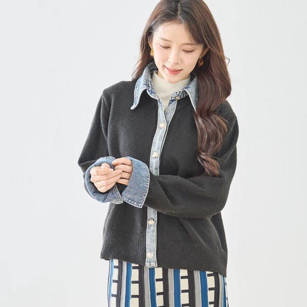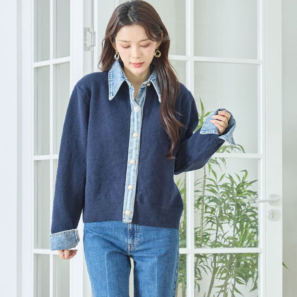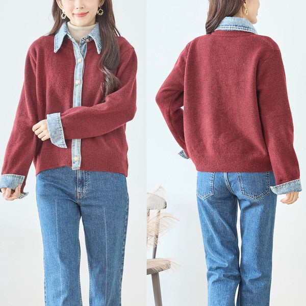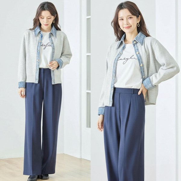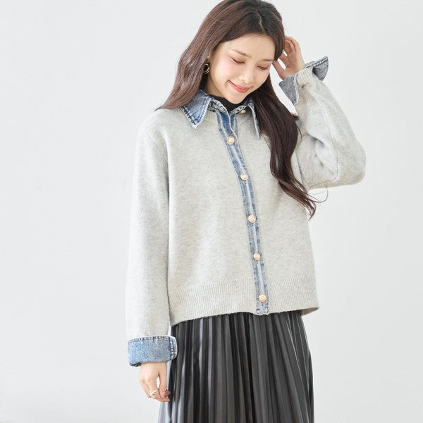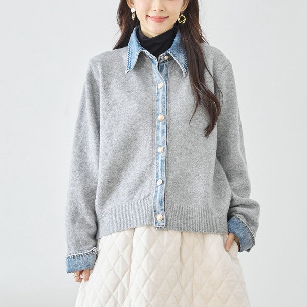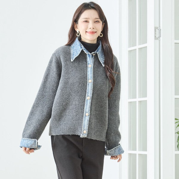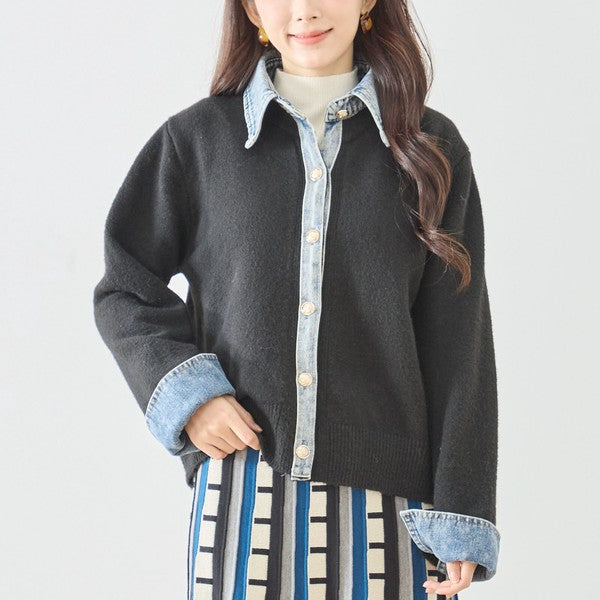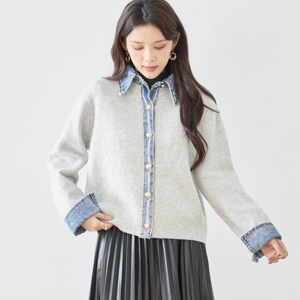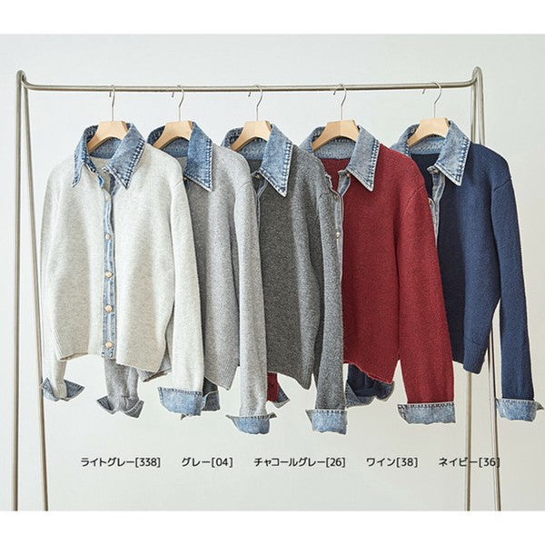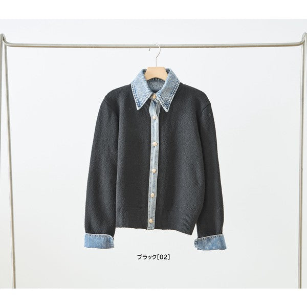 【M〜L】デニム衿コンビニットプルオーバーカーディガン|異素材ミックス・大人カジュアル・着回し万能|N22-221A