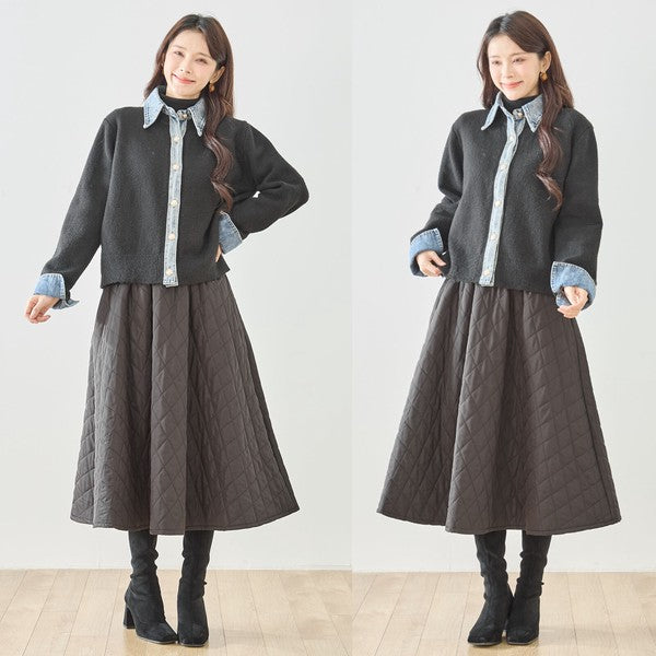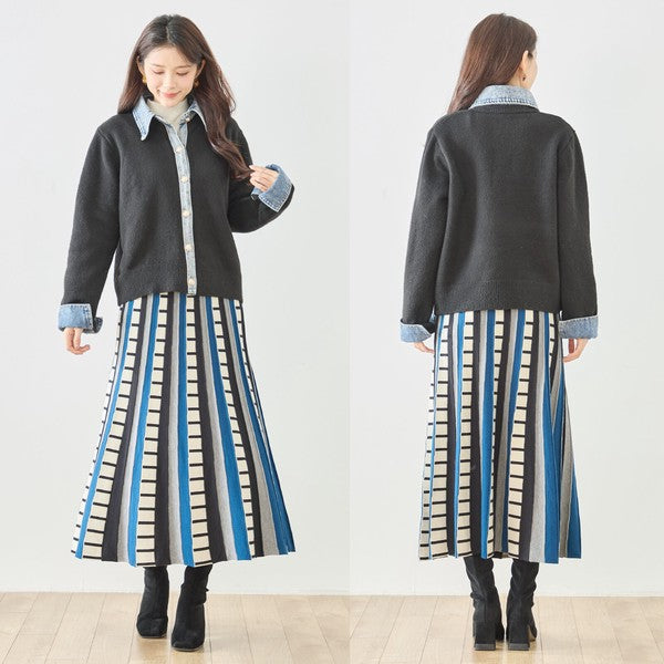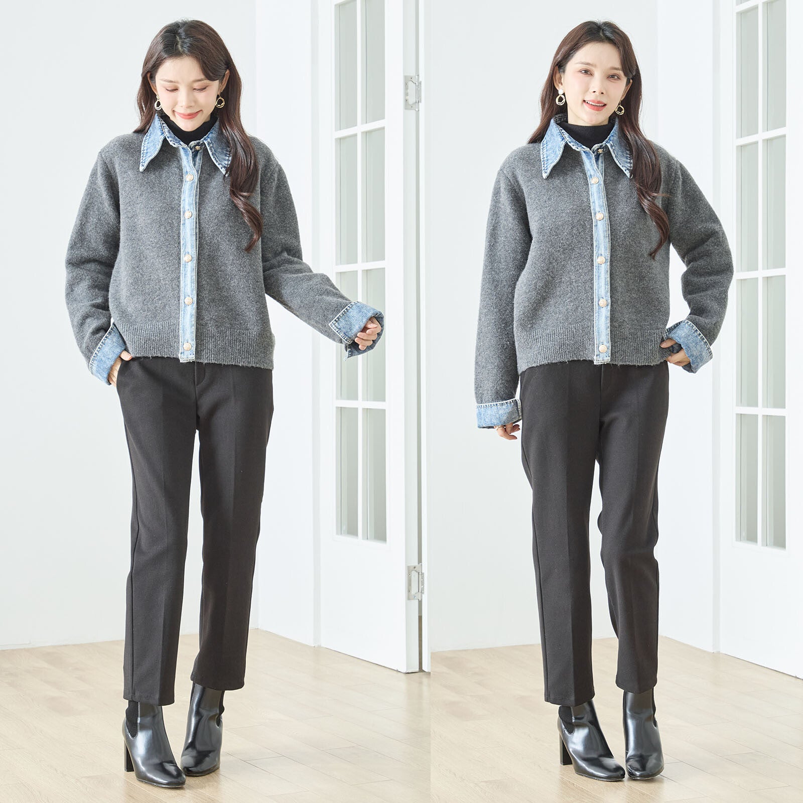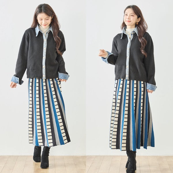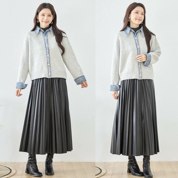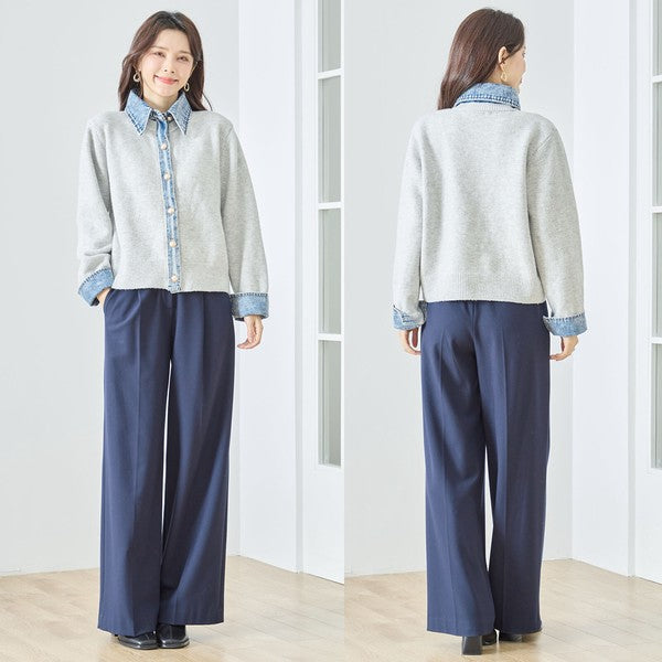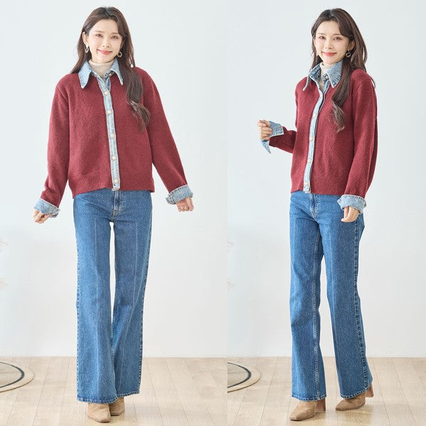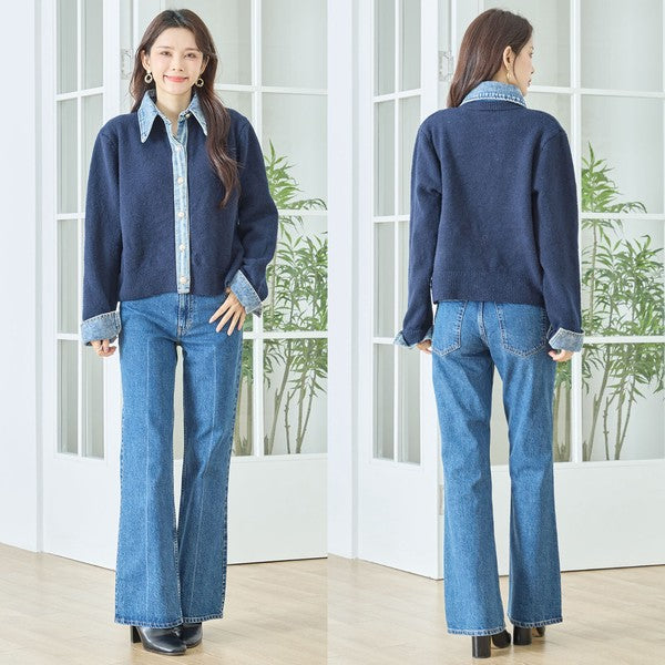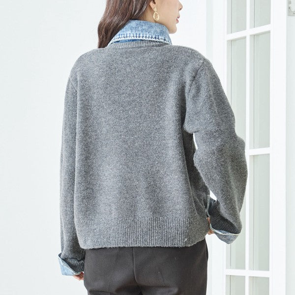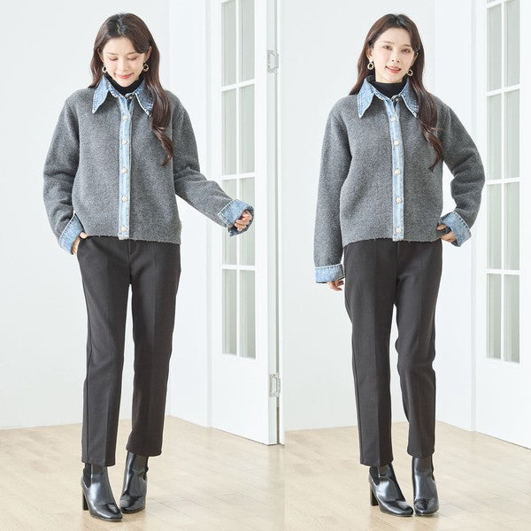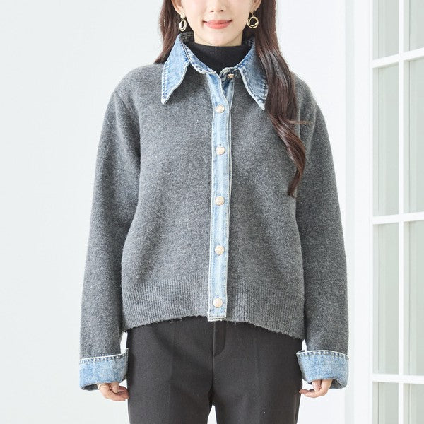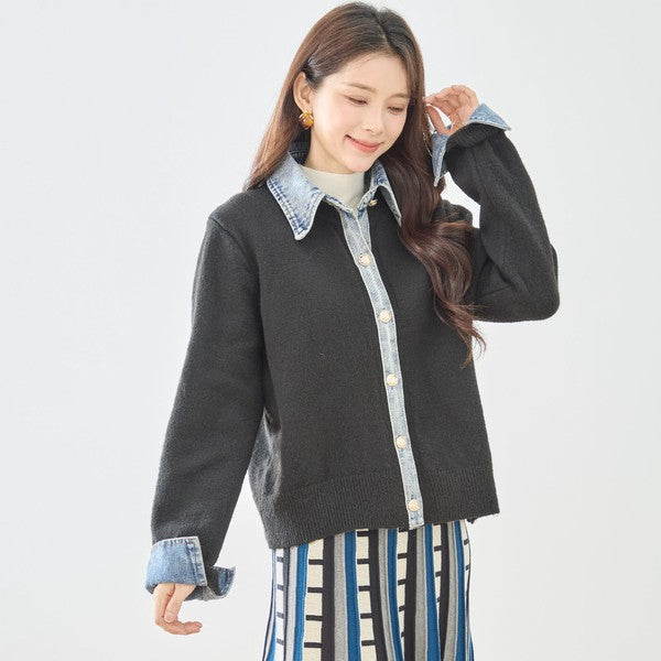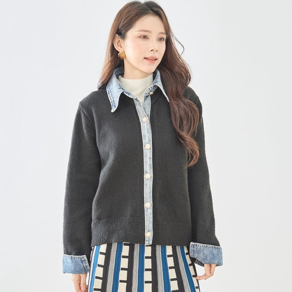 【M〜L】デニム衿コンビニットプルオーバーカーディガン|異素材ミックス・大人カジュアル・着回し万能|N22-221A