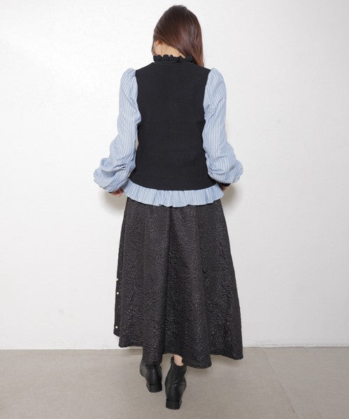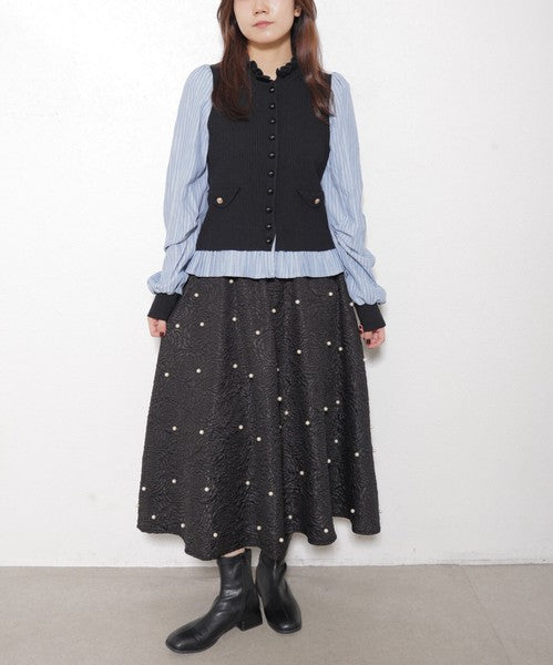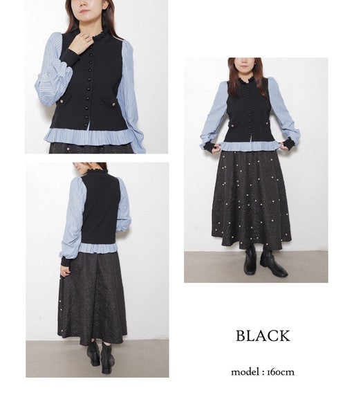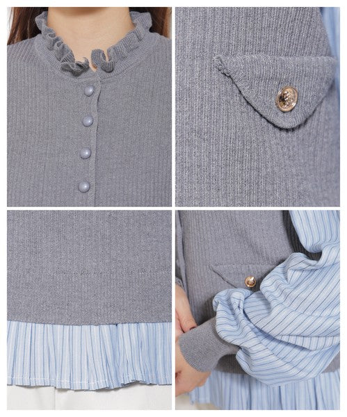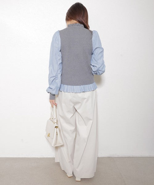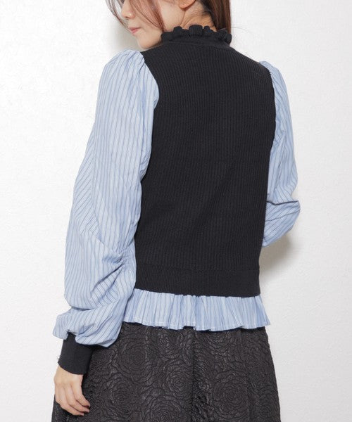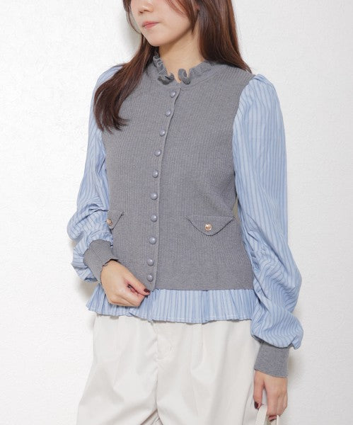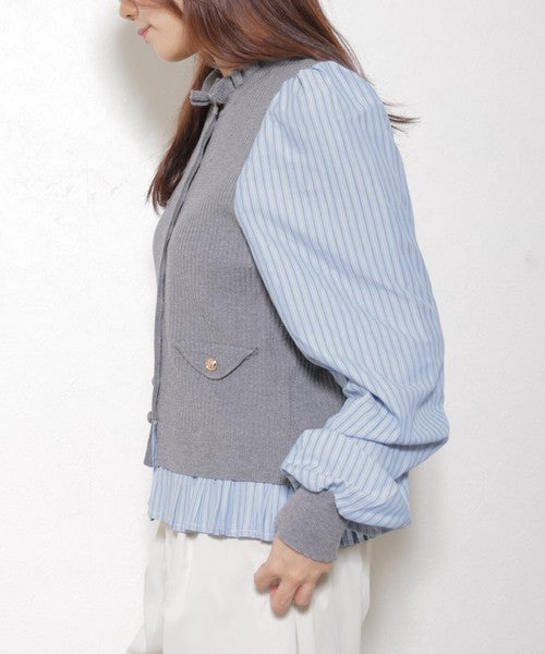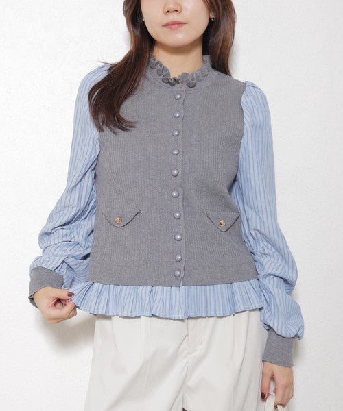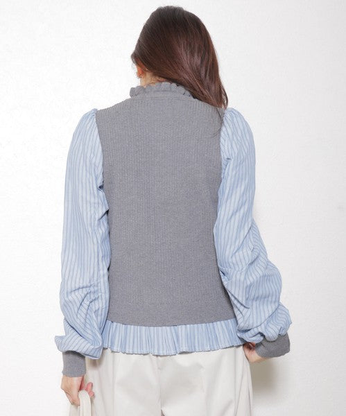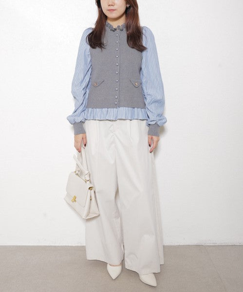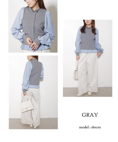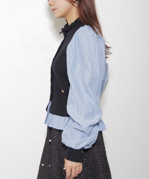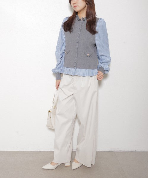 身頃は柔らかなニット、袖は軽やかなストライプブラウス素材で、程よいメリハリのあるシルエットに。