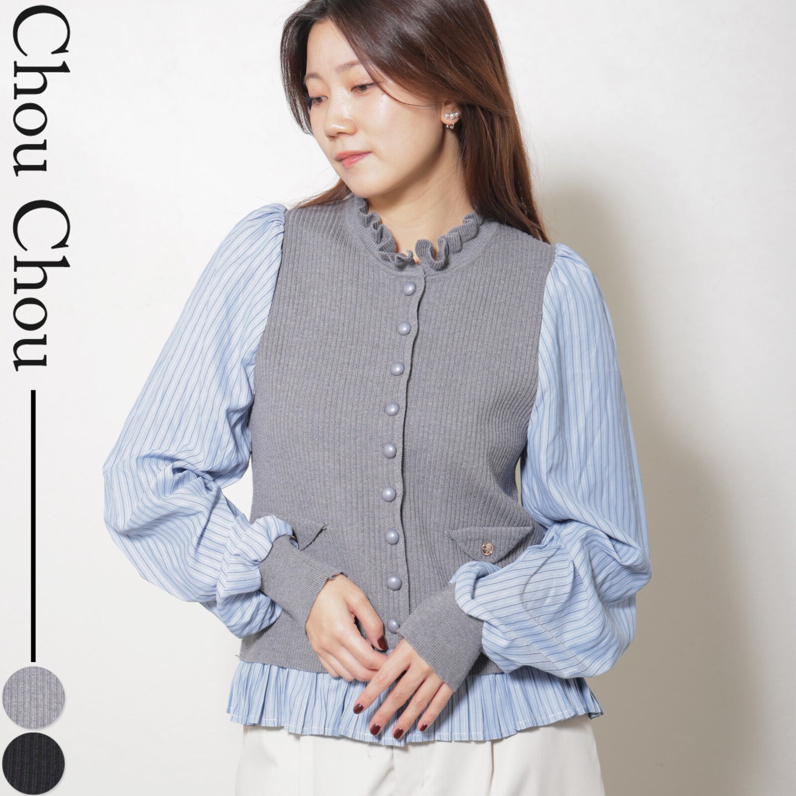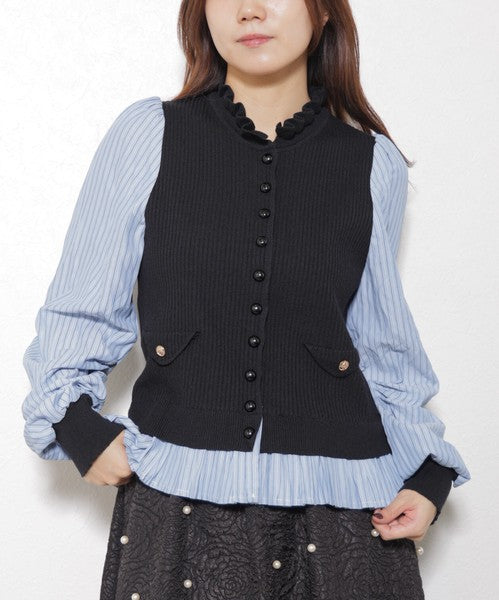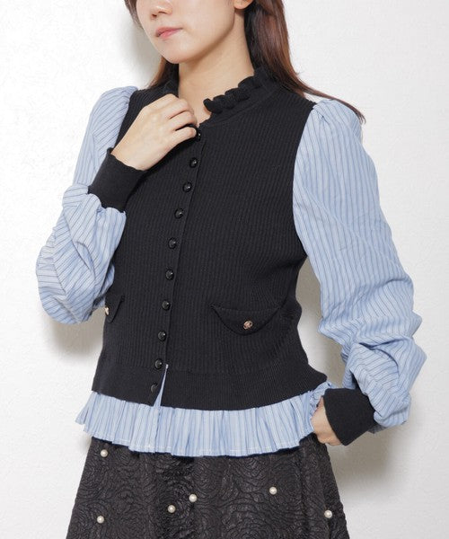 【Mサイズ】異素材切替・フリル襟ニットカーディガン|ブラウスドッキング・長袖・きれいめ大人可愛い・14104979