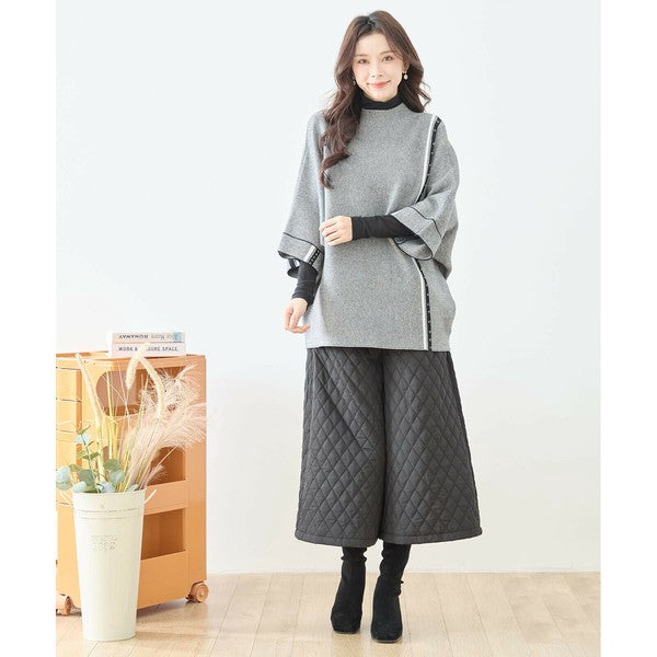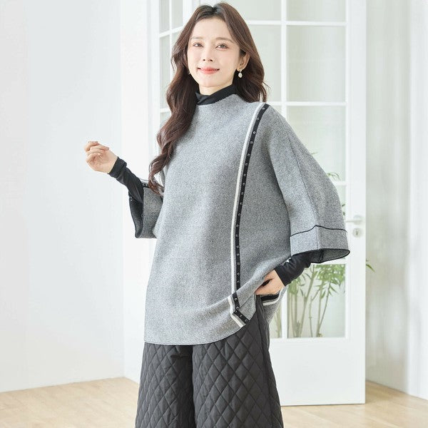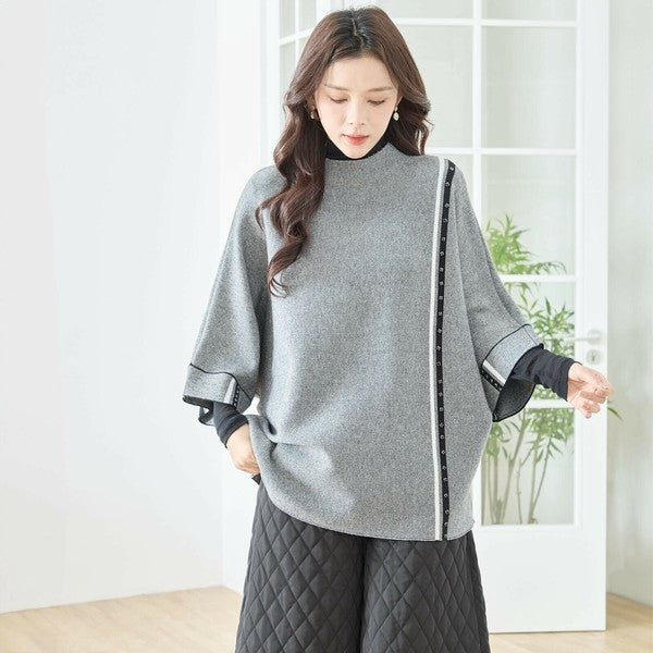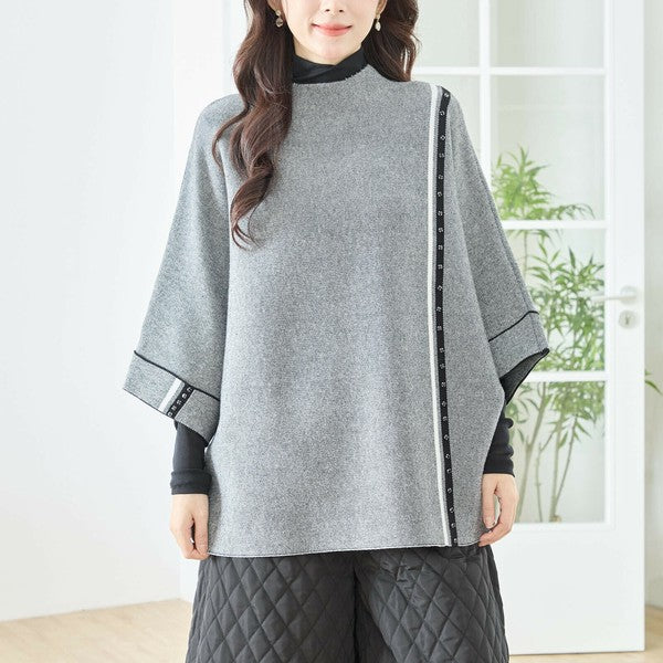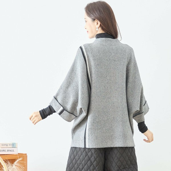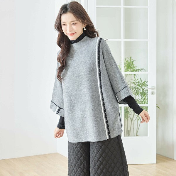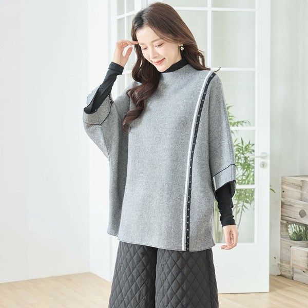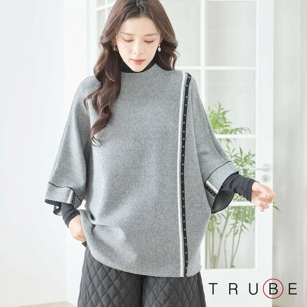【L〜LL】配色ラインポンチョプルオーバー|ゆったり体型カバー・ハイネック・大人モード・TRUBE・N12-874