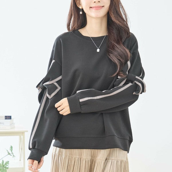 程よいゆとりと抜け感を兼ね備えた、大人可愛い「リボンスリーブデザインプルオーバー」。袖に施したリボンデザインとラインテープがポイントで、シンプルながら華やかな印象をプラスします。