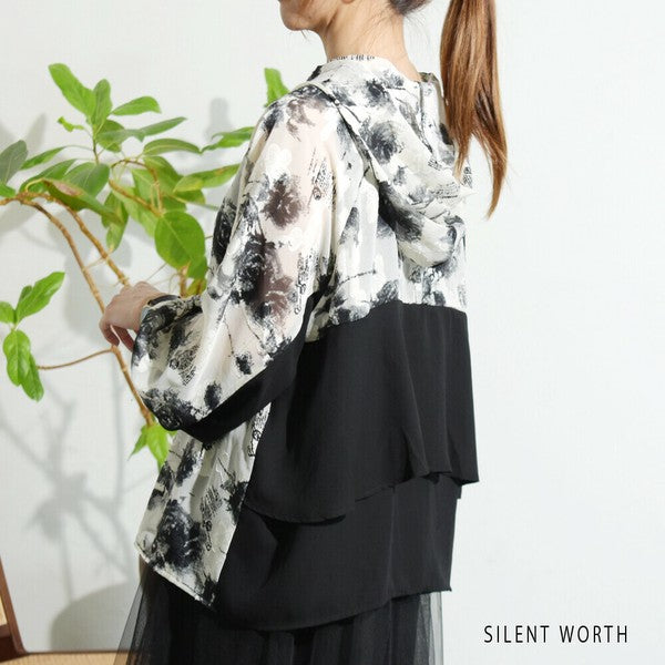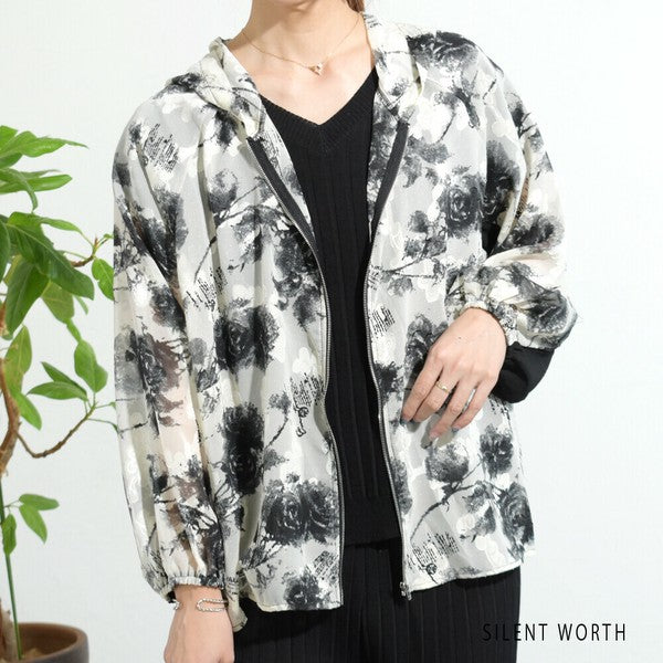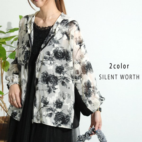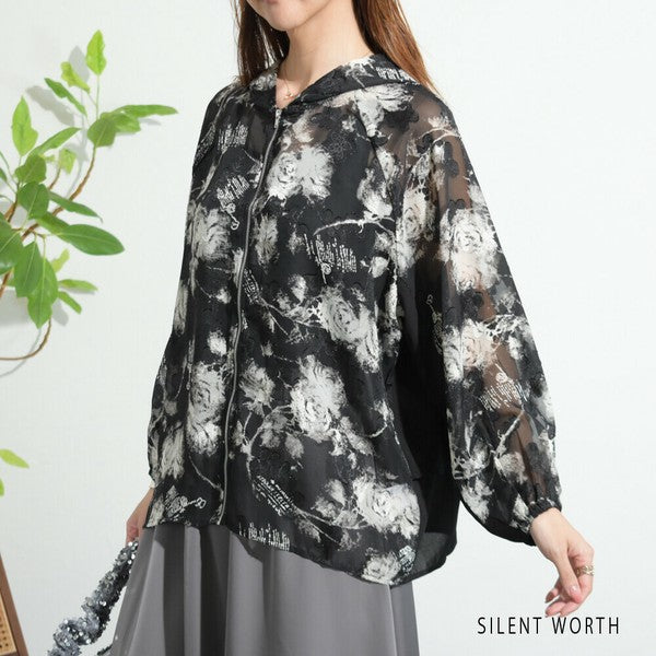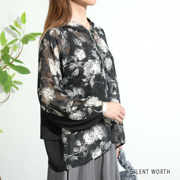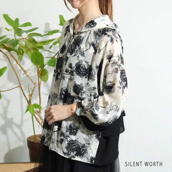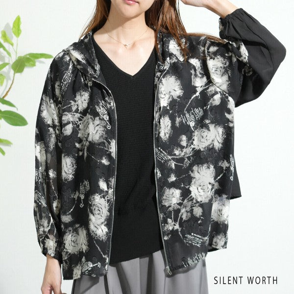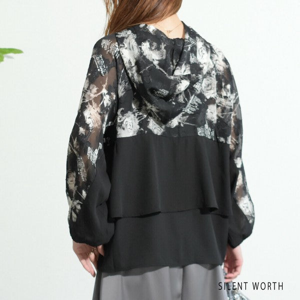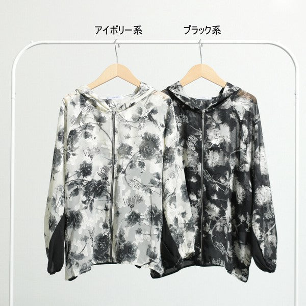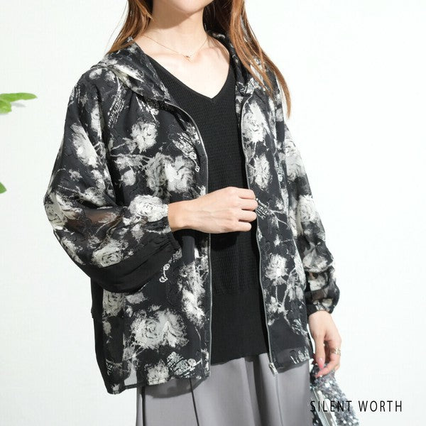 繊細な花柄とブラックの切替が印象的なシアーパーカー。