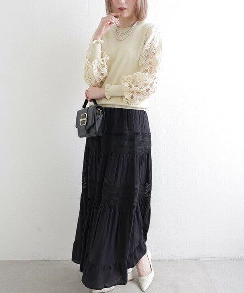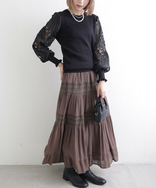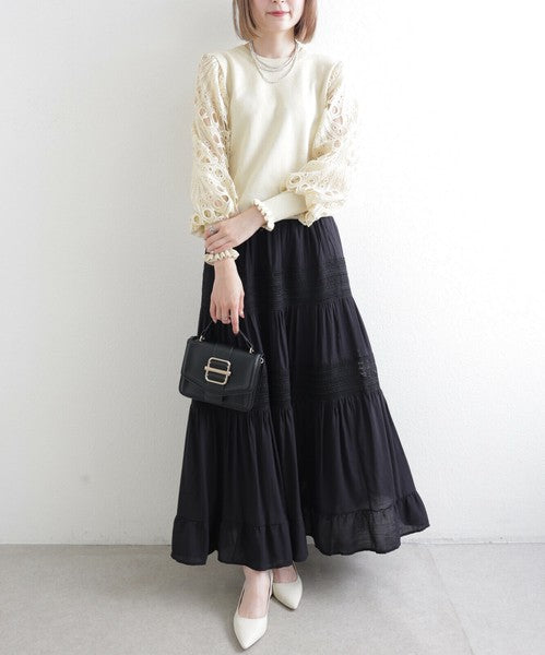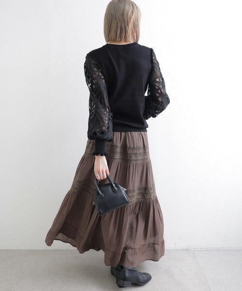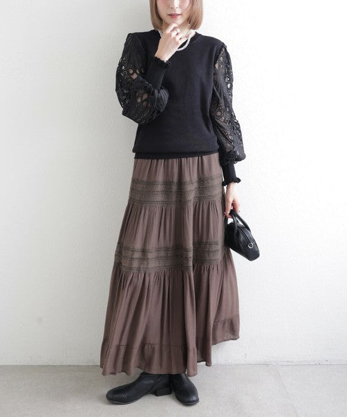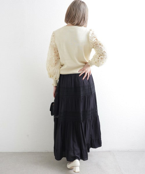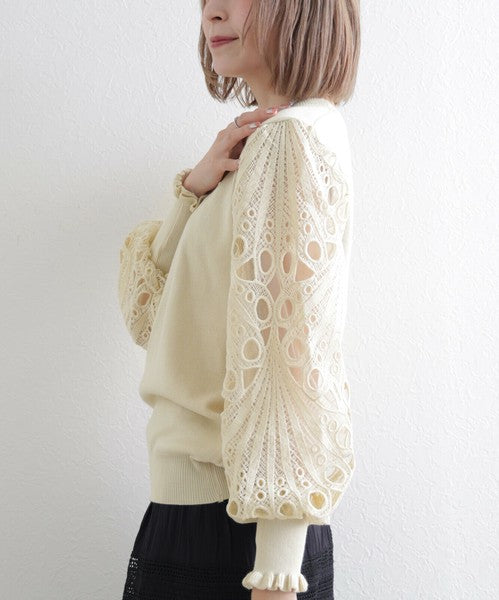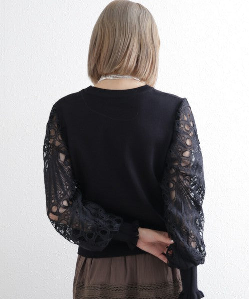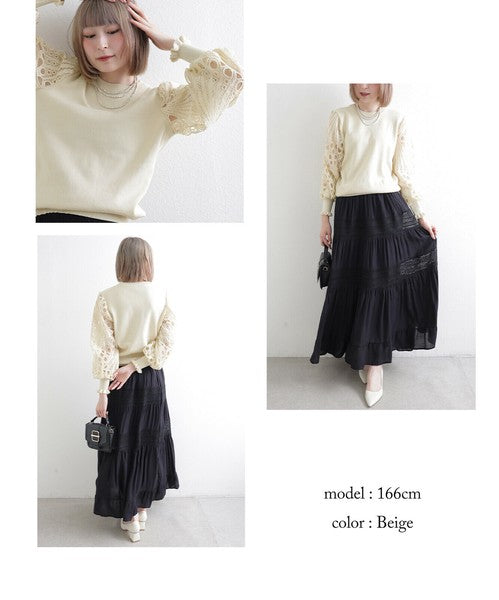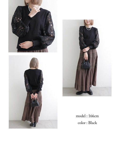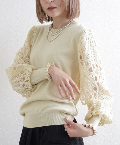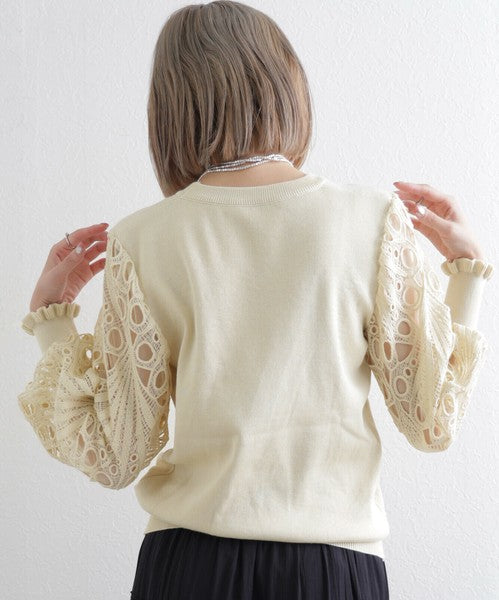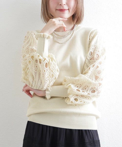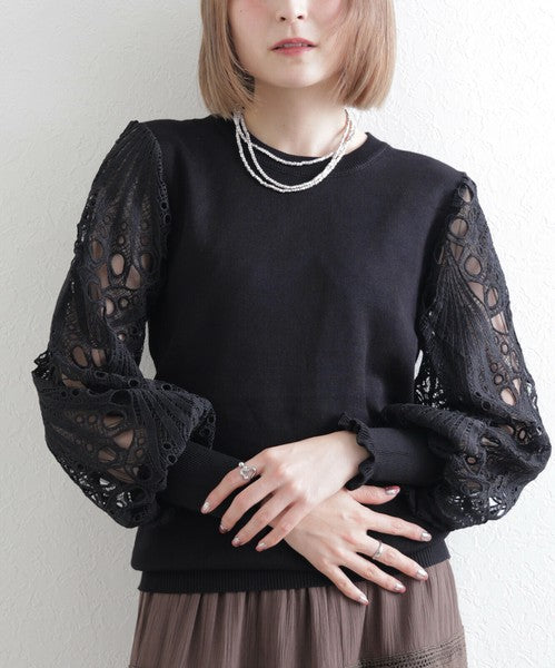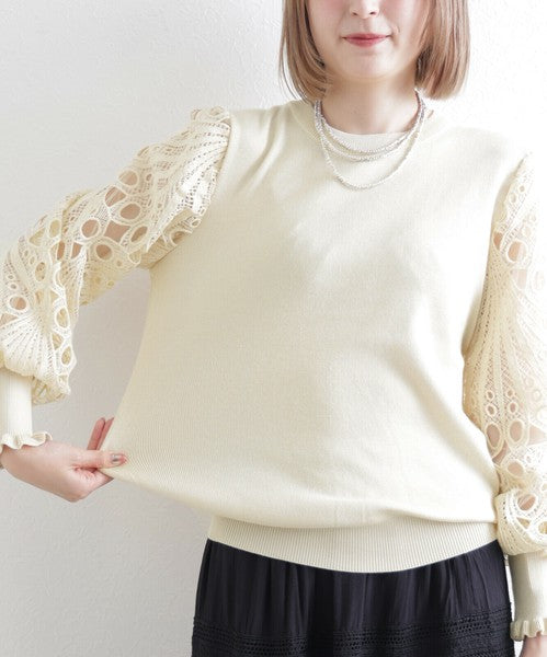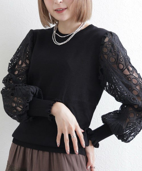 【M〜L】袖レース切替ニットブラウス|透け感・華やぎトップス・秋冬春対応・ChouChou 192458