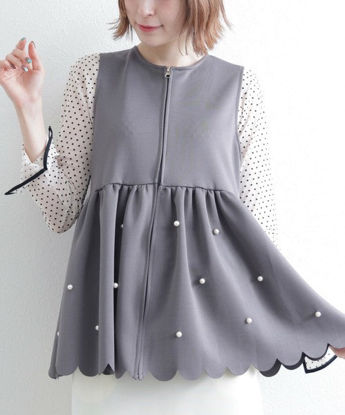 【M〜L】フェイクパール スカラップベスト|前開き ジップ ギャザー切替 フェミニンシルエット・Economico 13871360