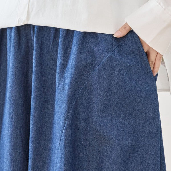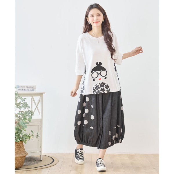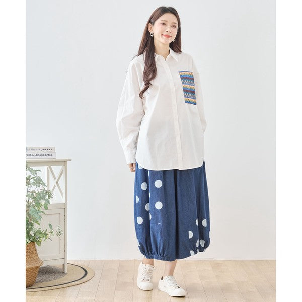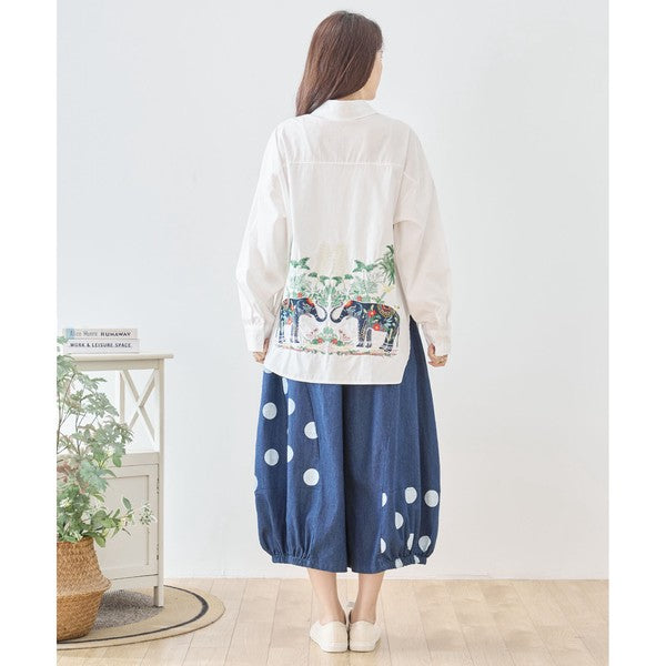 ドット柄の切替デザインが印象的なTRUBEのバルーンデニムパンツ。綿100%のナチュラルな素材感と、体型をカバーする立体的なシルエットが魅力。大人カジュアルを格上げするMikonosublueのおすすめアイテム。