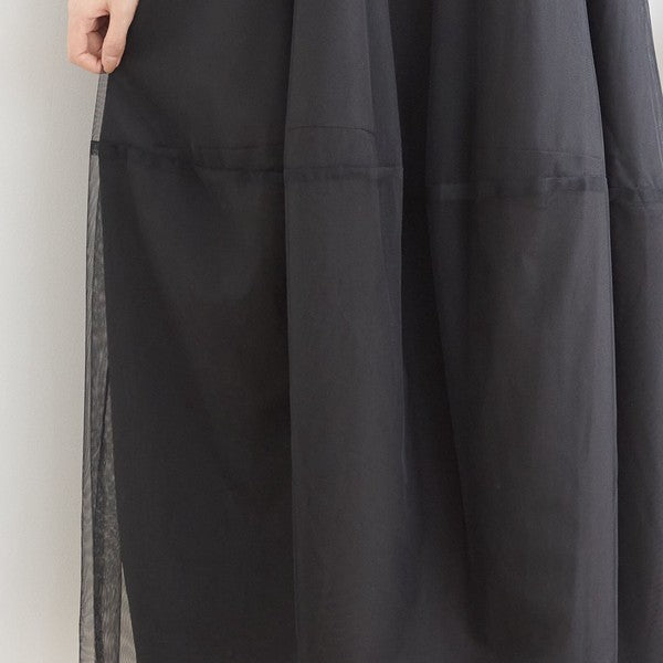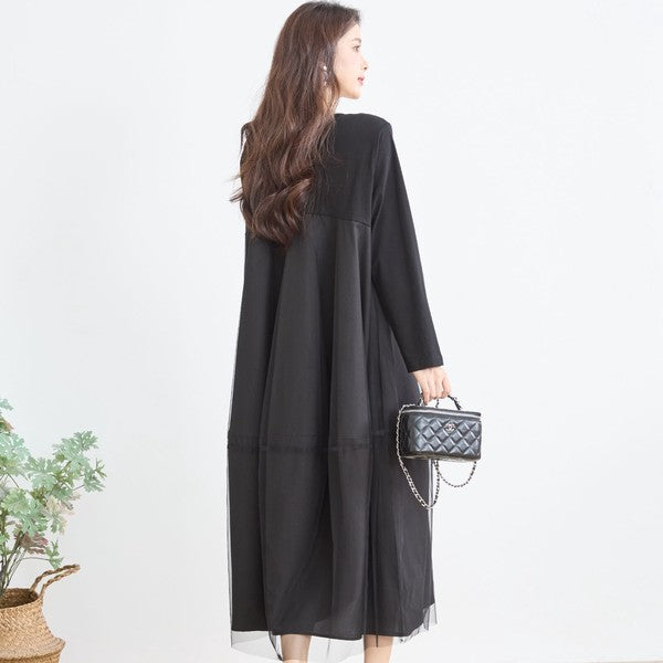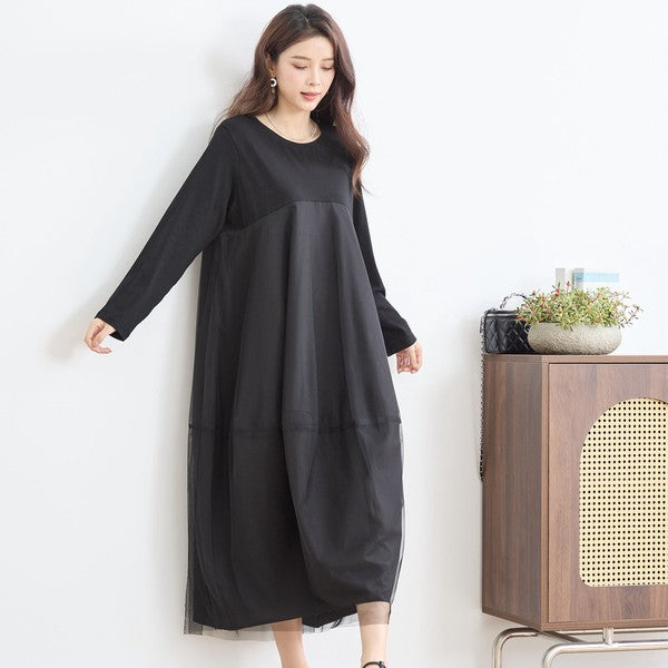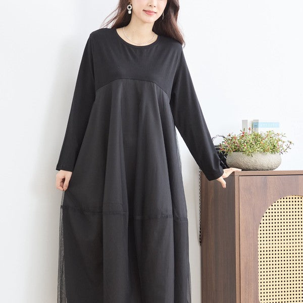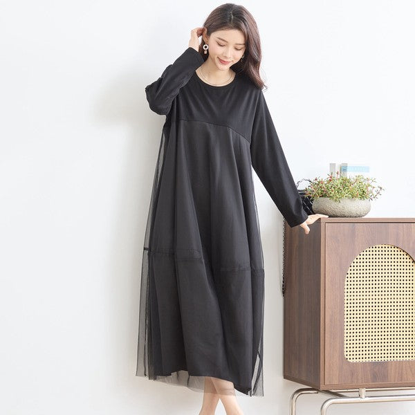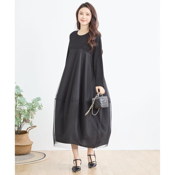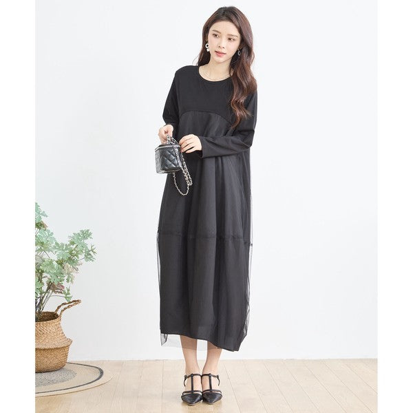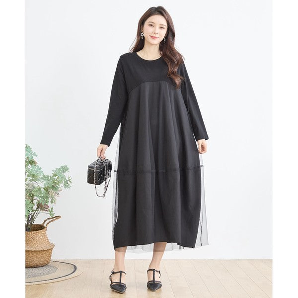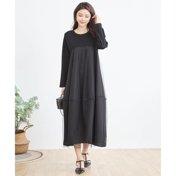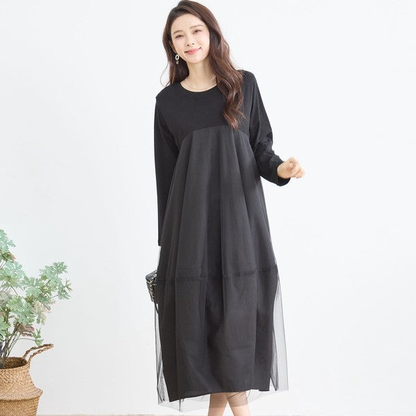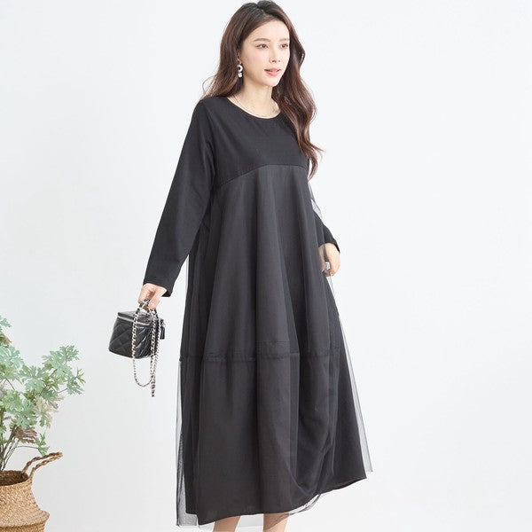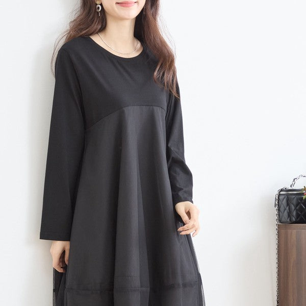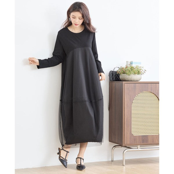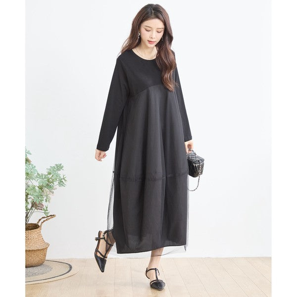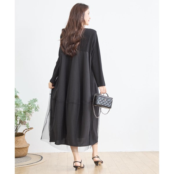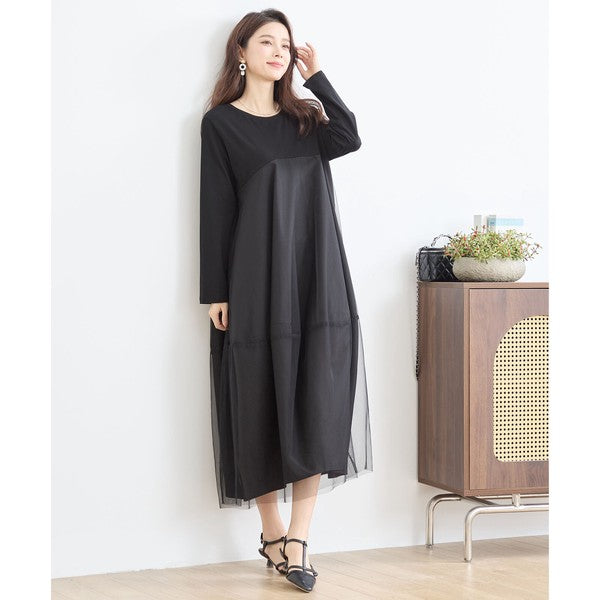 チュールドッキング ワンピース ロング丈 長袖 クルーネック ゆったり 体型カバー きれいめ 春 夏
