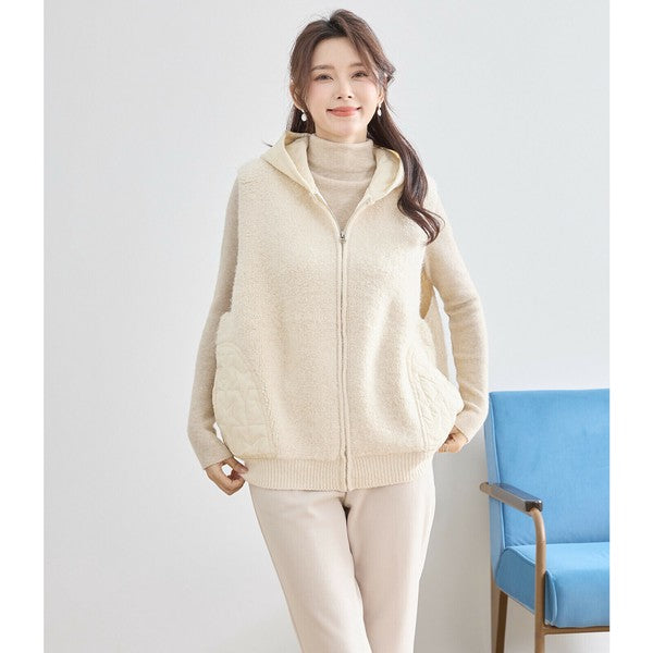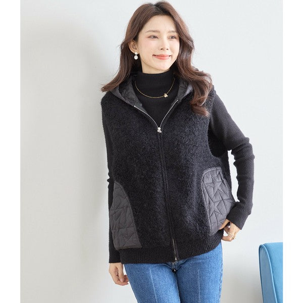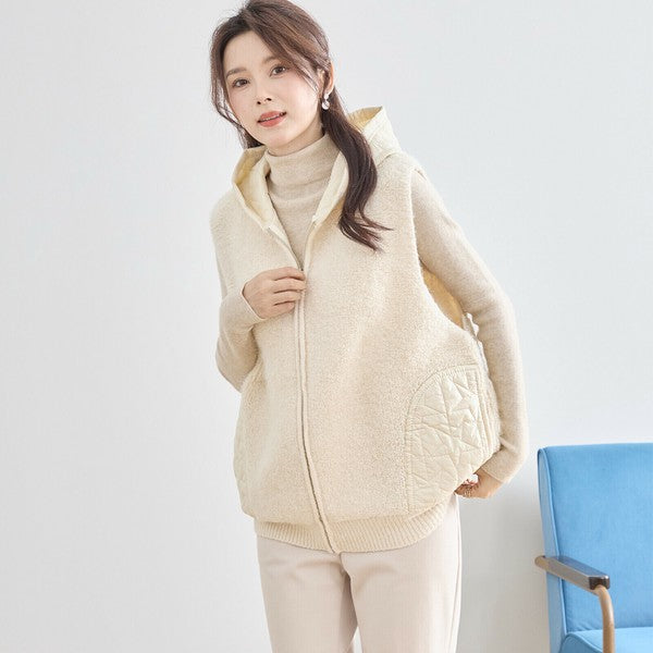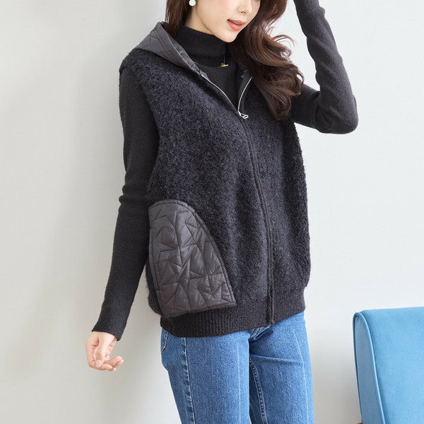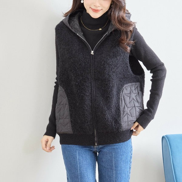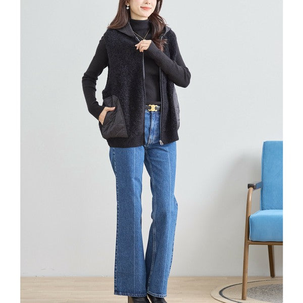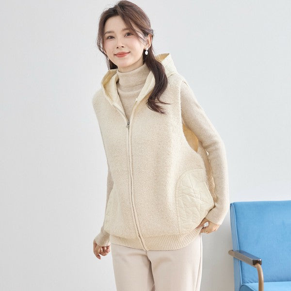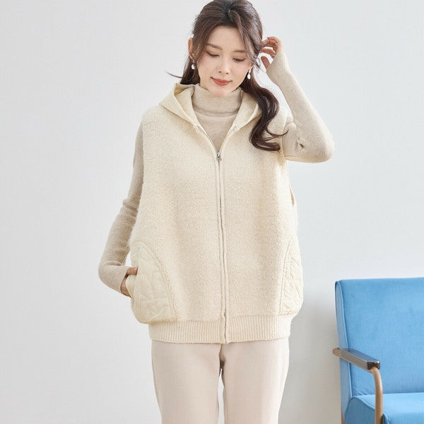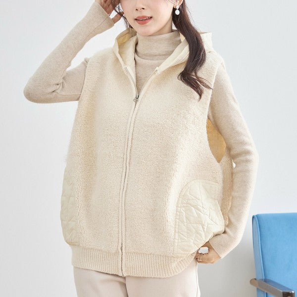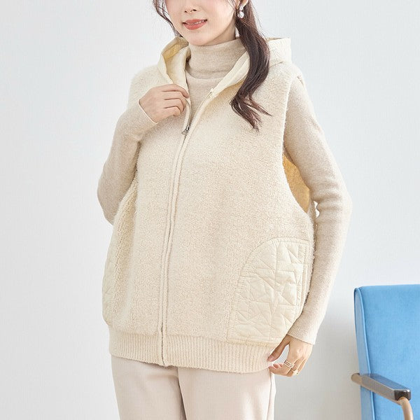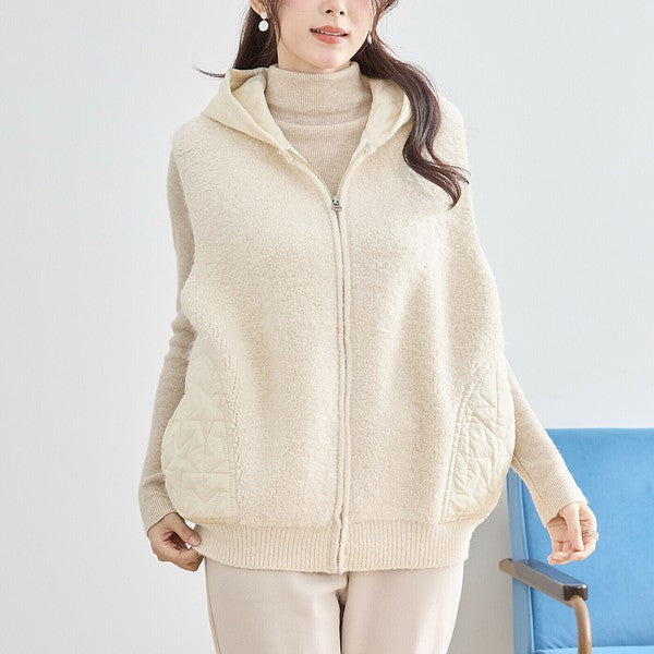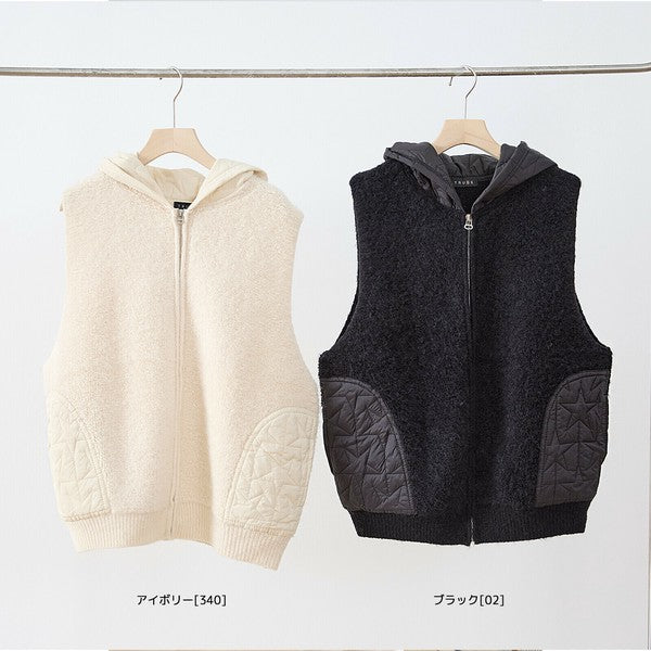 【M〜L】星柄キルティングブークレニットベスト|TRUBE レディース フード付き 異素材切替 ジップ 前開き N35-025A