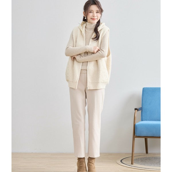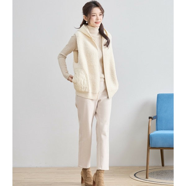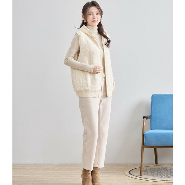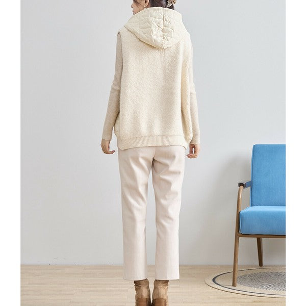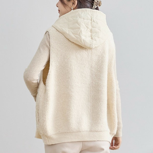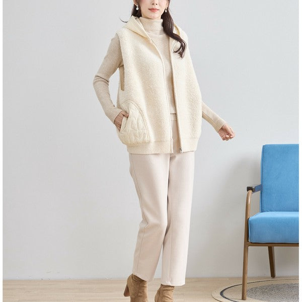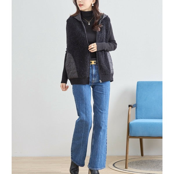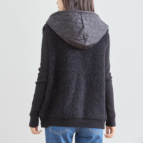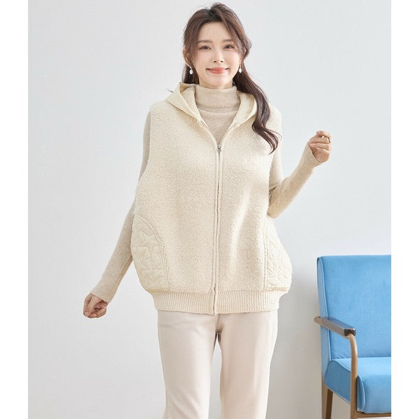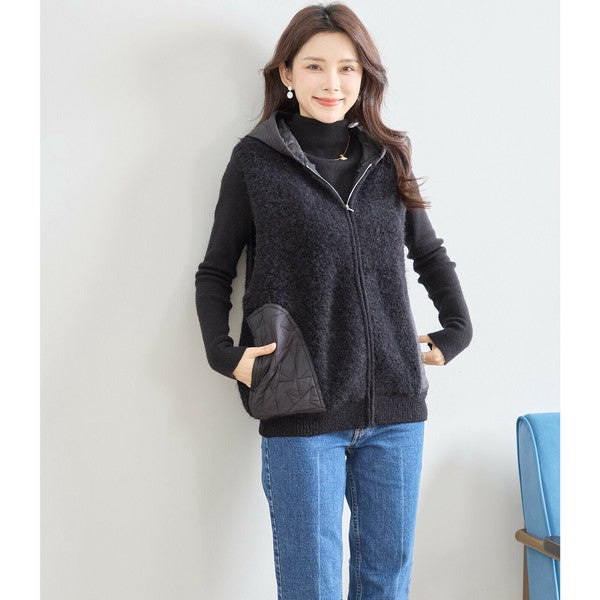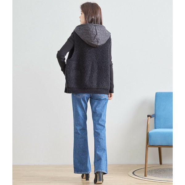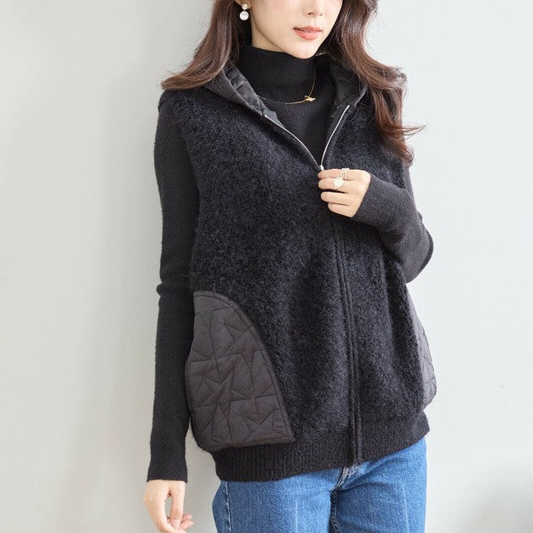 【M〜L】星柄キルティングブークレニットベスト|TRUBE レディース フード付き 異素材切替 ジップ 前開き N35-025A