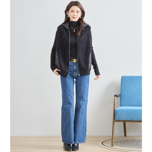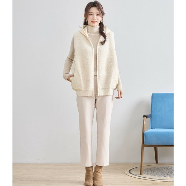 フード付きで顔まわりを優しく包み、カジュアルすぎない大人のニュアンスに仕上げました。