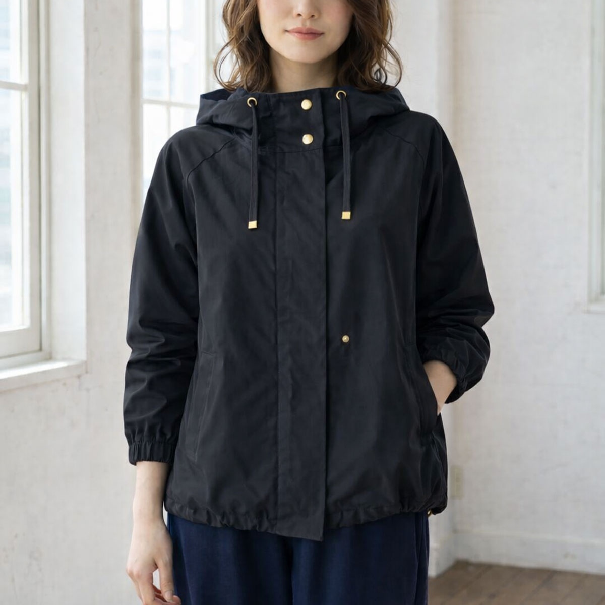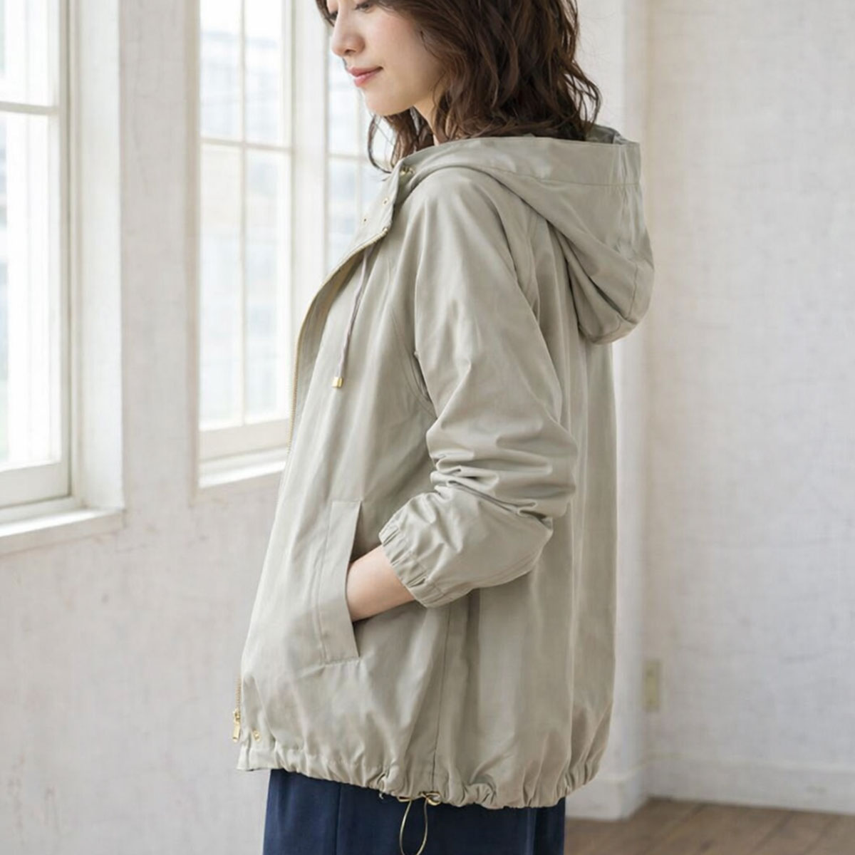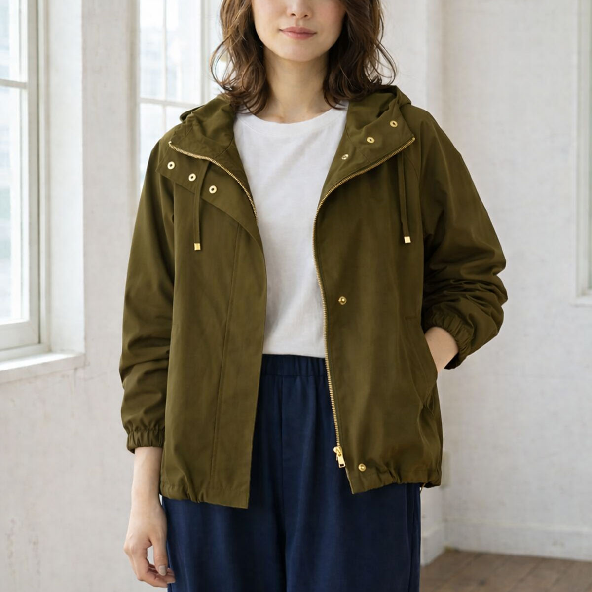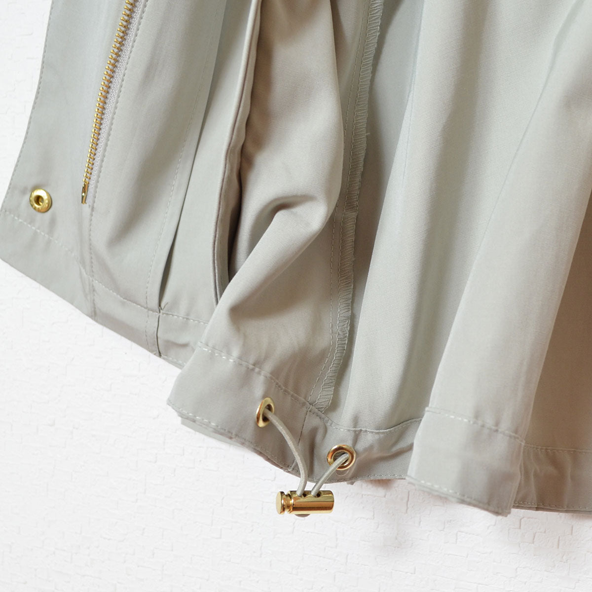 ハリのあるしっかりとした生地に「撥水加工」をプラス。 急な雨や風を通しにくく、季節の変わり目の羽織りとして頼れる一着です。 機能的でありながら、ゴールドの金具使いが洗練された雰囲気を演出し、タウンユースにも馴染む上品なデザインに仕上げました。