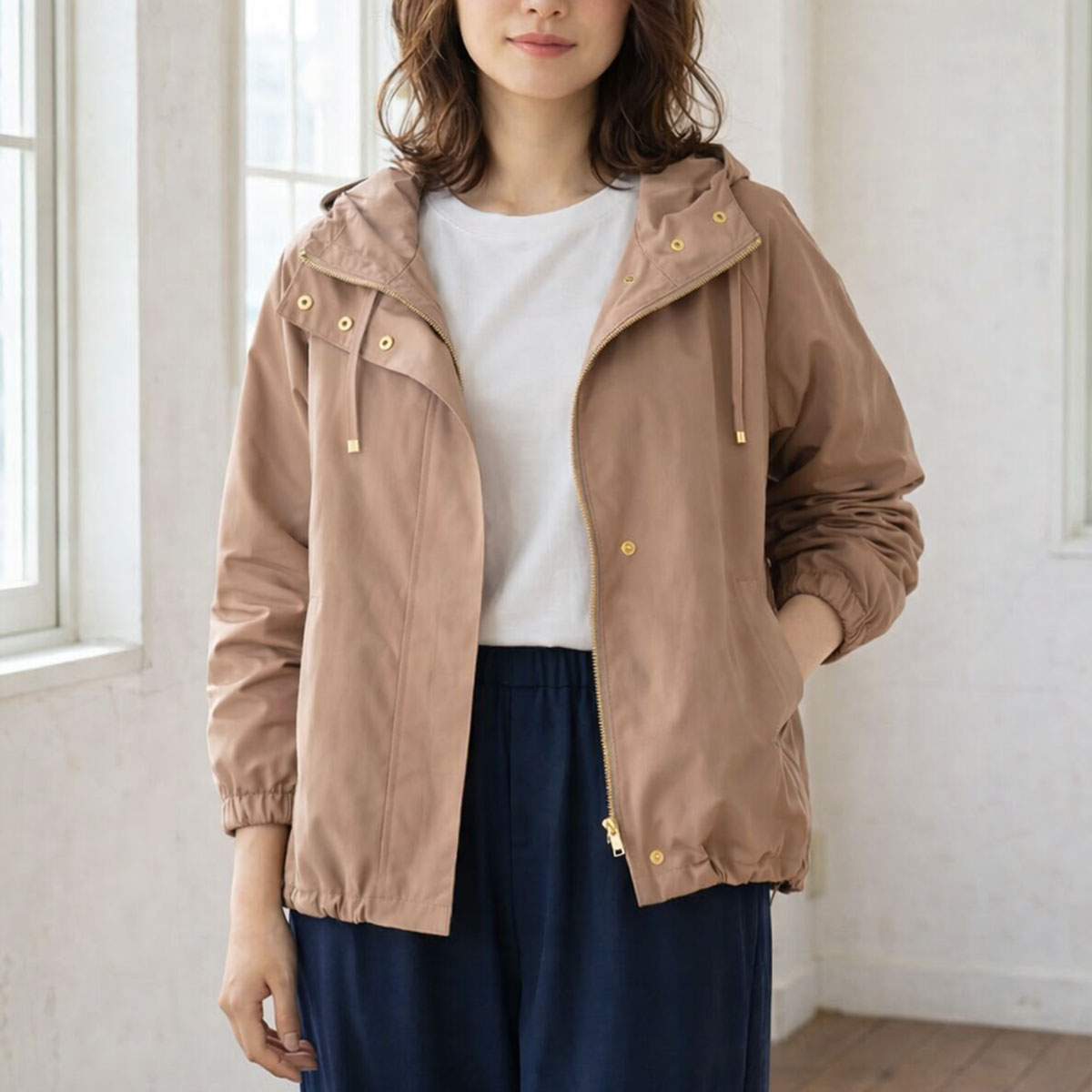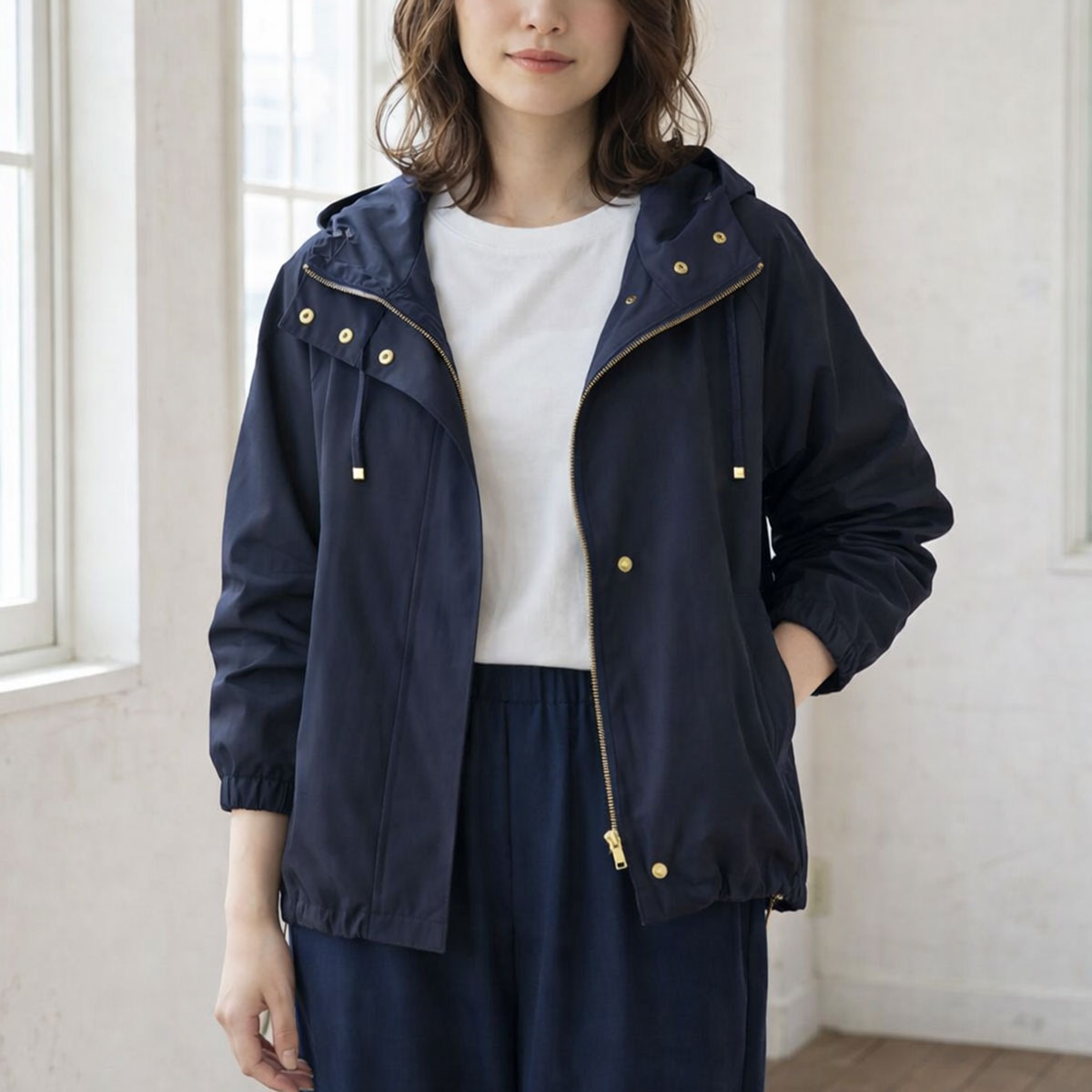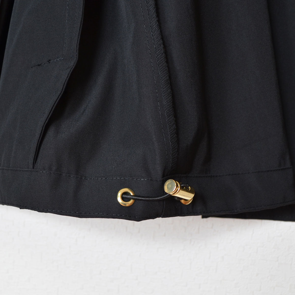 ハリのあるしっかりとした生地に「撥水加工」をプラス。 急な雨や風を通しにくく、季節の変わり目の羽織りとして頼れる一着です。 機能的でありながら、ゴールドの金具使いが洗練された雰囲気を演出し、タウンユースにも馴染む上品なデザインに仕上げました。