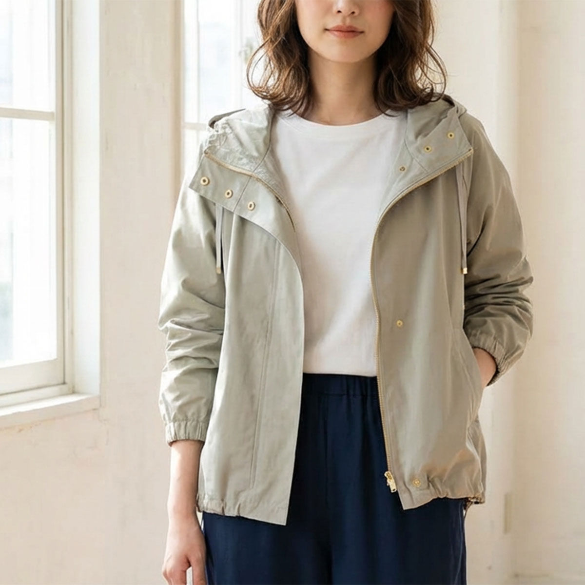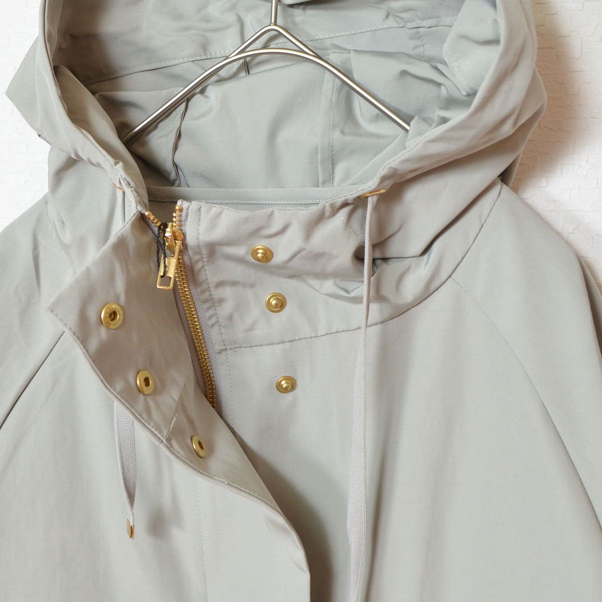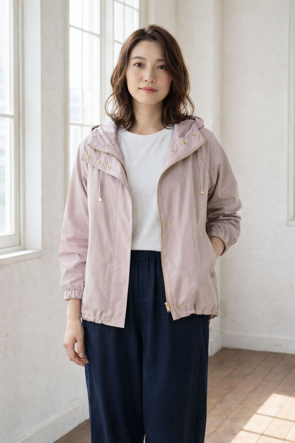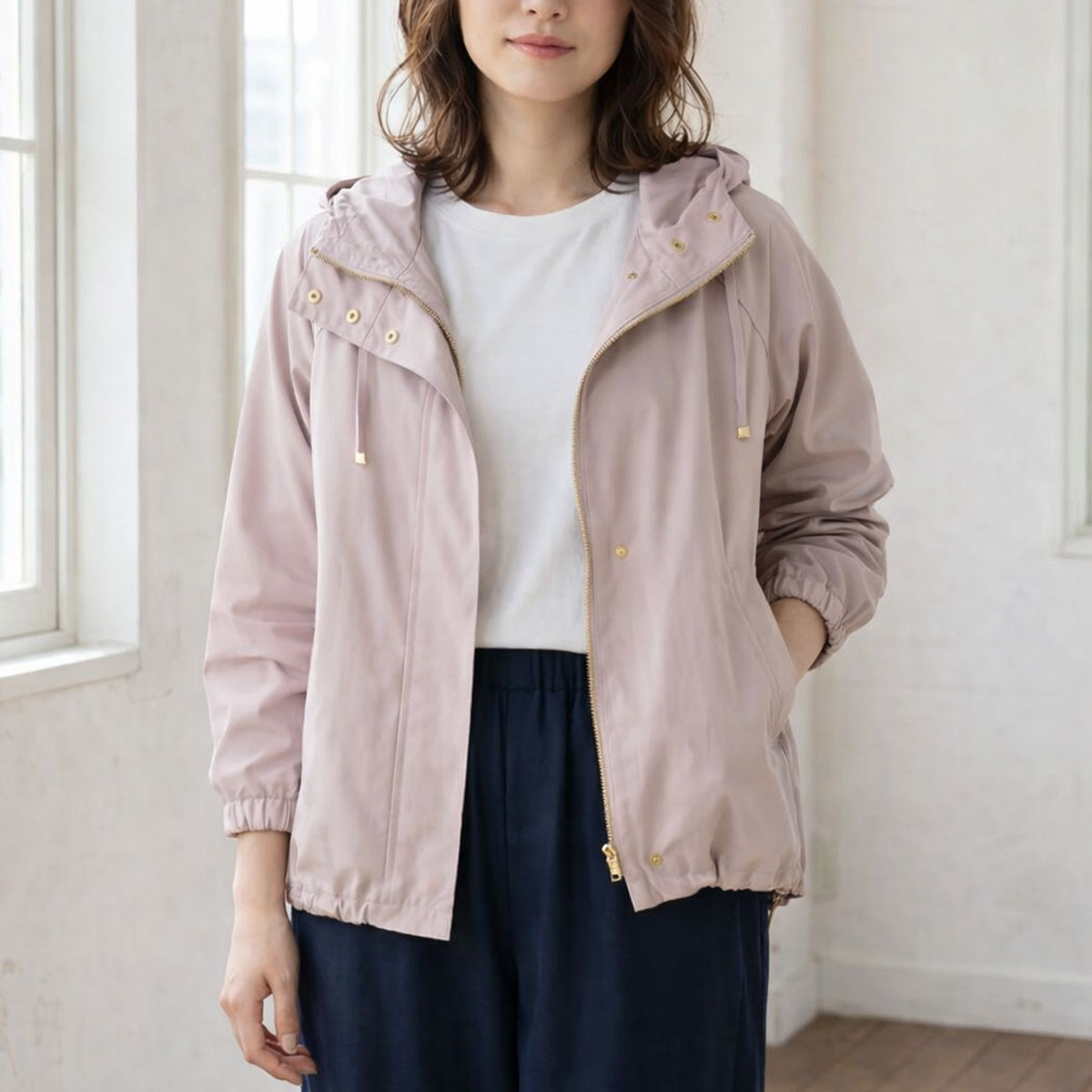 ハリのあるしっかりとした生地に「撥水加工」をプラス。 急な雨や風を通しにくく、季節の変わり目の羽織りとして頼れる一着です。 機能的でありながら、ゴールドの金具使いが洗練された雰囲気を演出し、タウンユースにも馴染む上品なデザインに仕上げました。