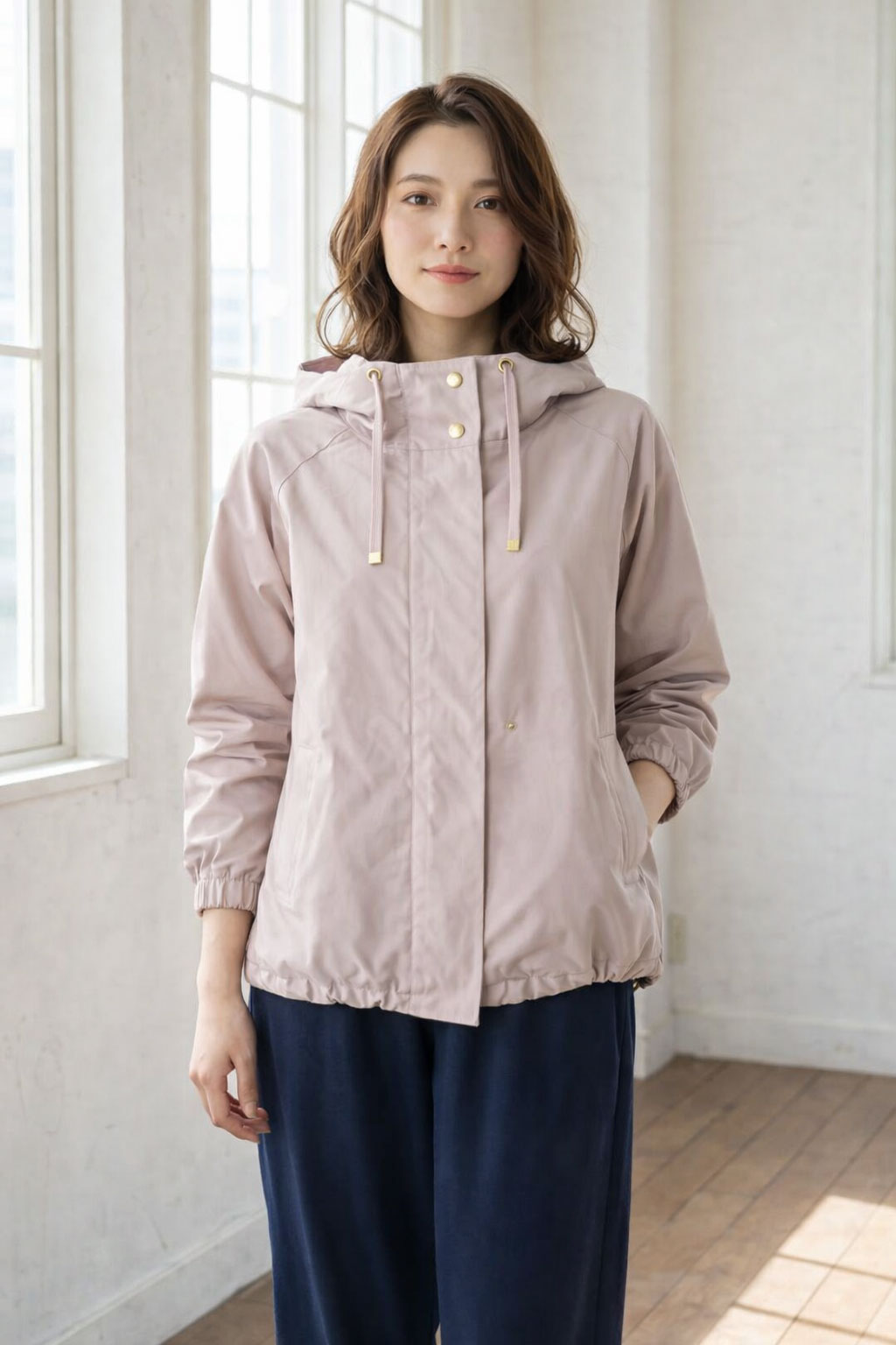 ・スペック: 撥水加工 / フード付き / 前開き(ファスナー&スナップ) / 裾ドロスト / 袖口ゴム / ポケットあり